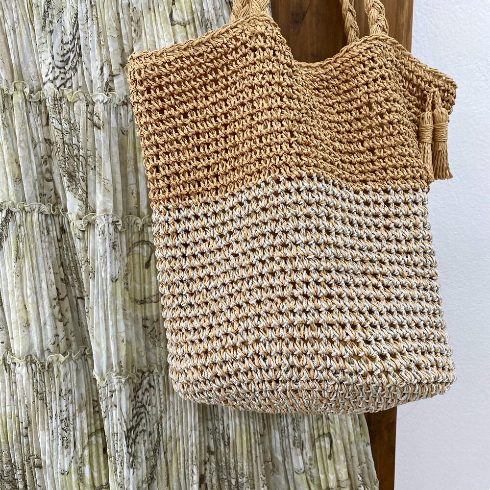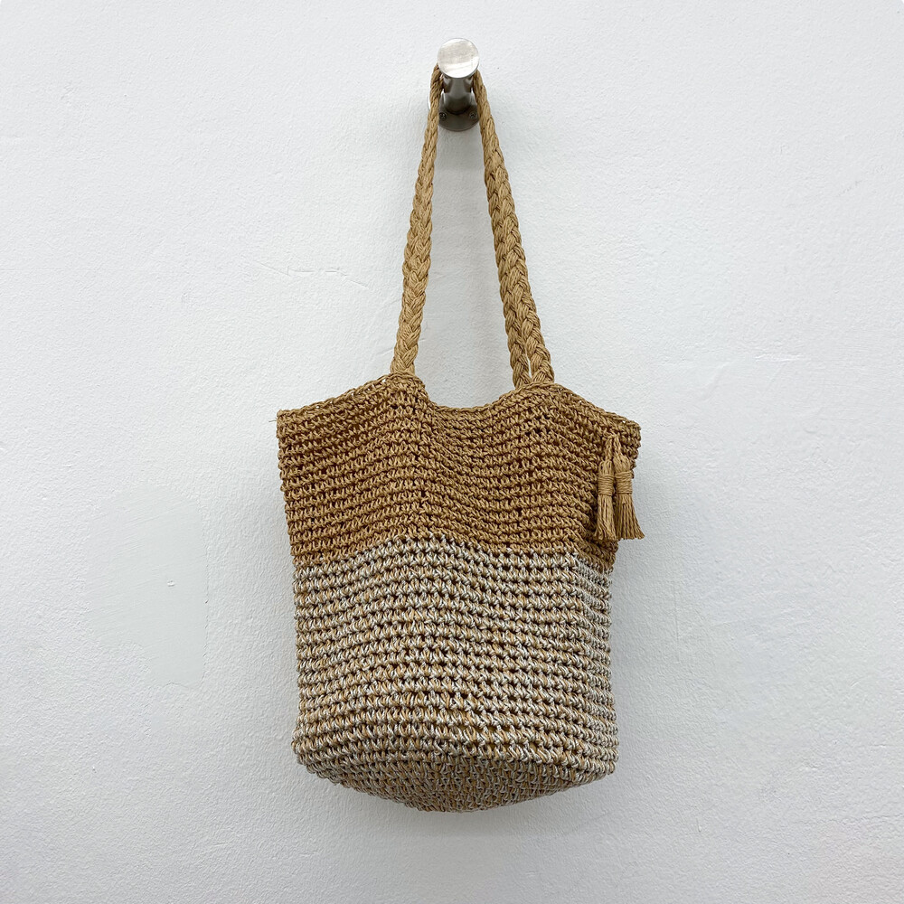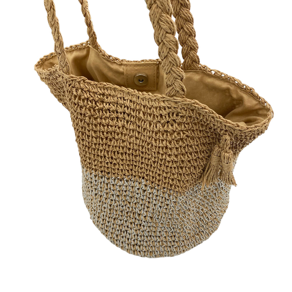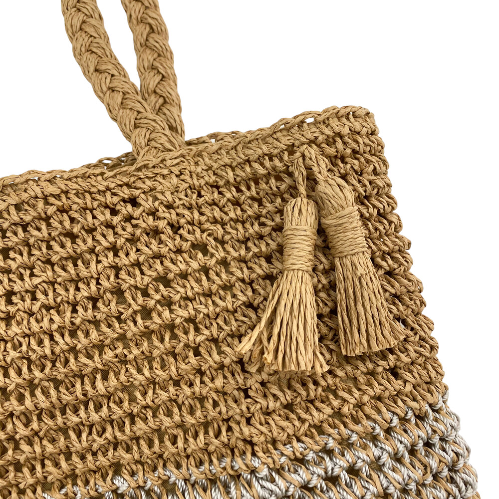 베이지색과 연한 회색 조합의 여름 가방입니다.