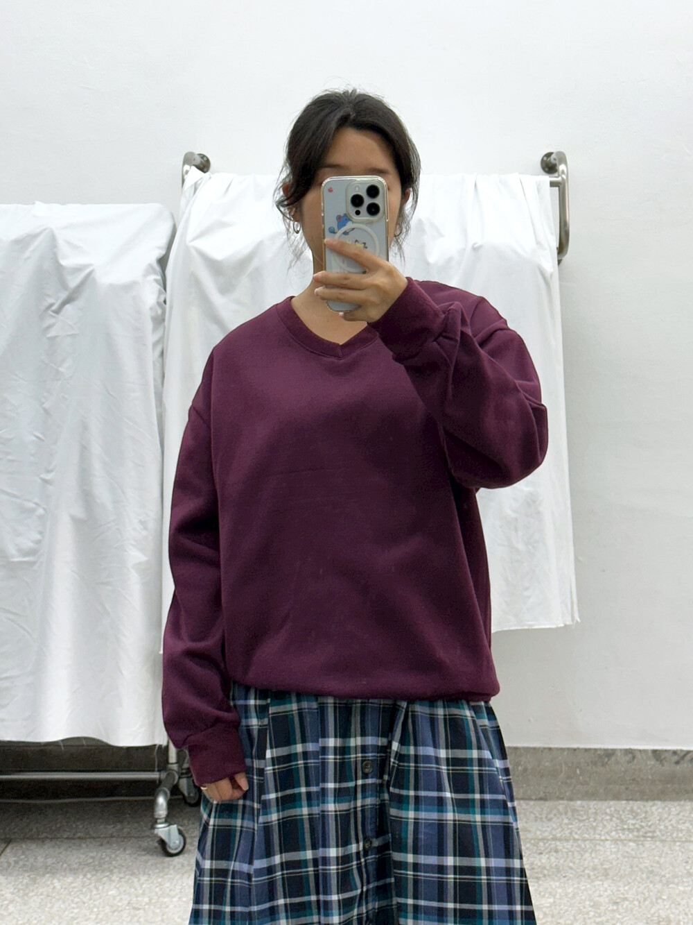 짙은 버건디색상의 맨투맨 상의입니다.