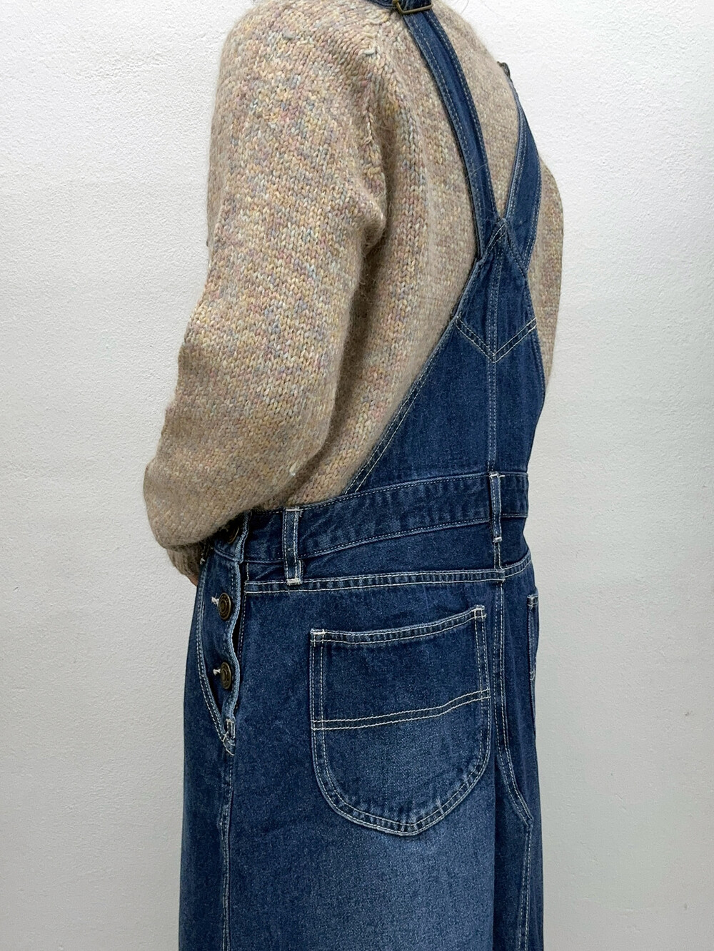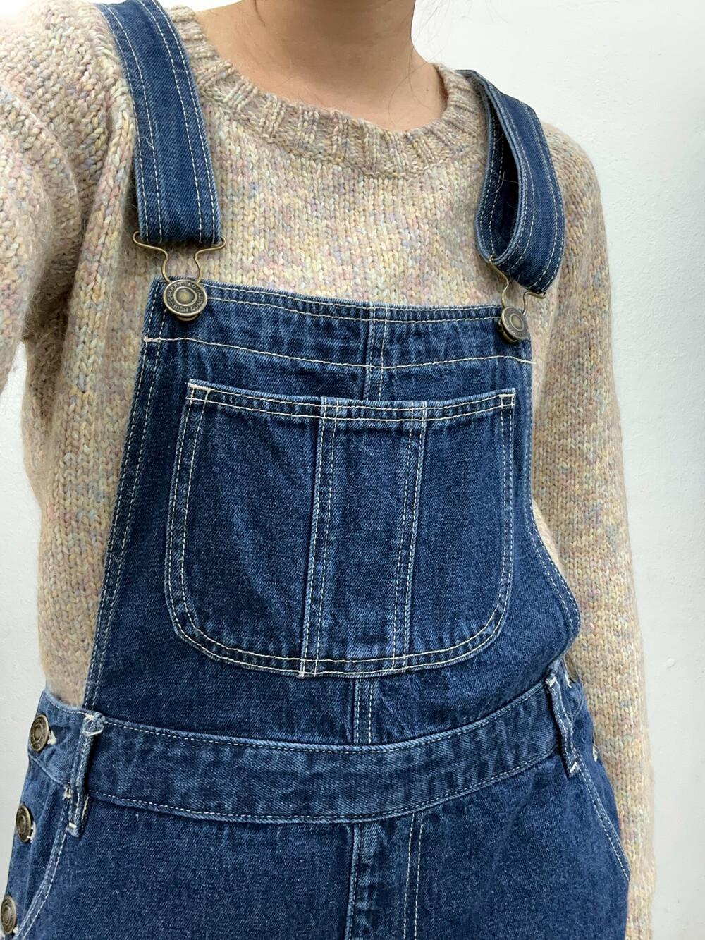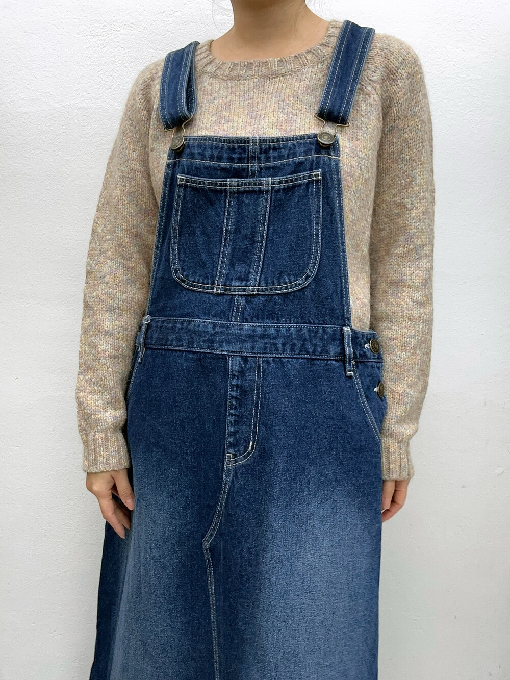 중청 색감의 오버롤 원피스입니다.