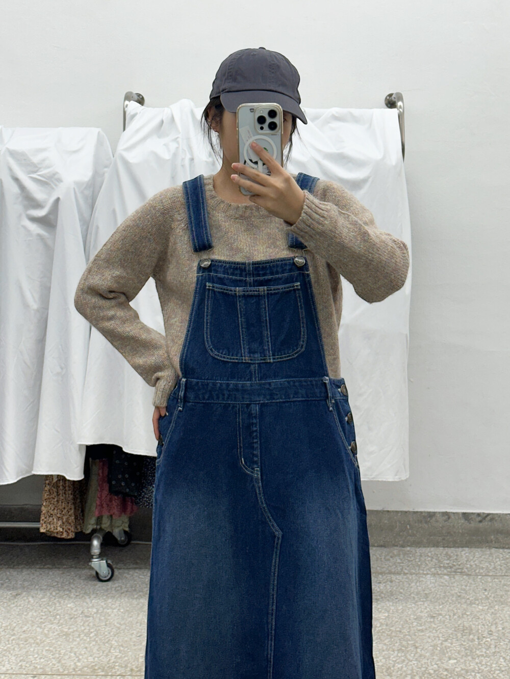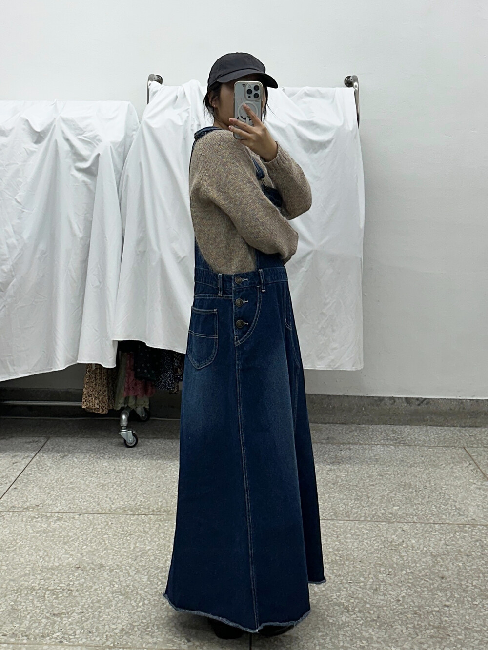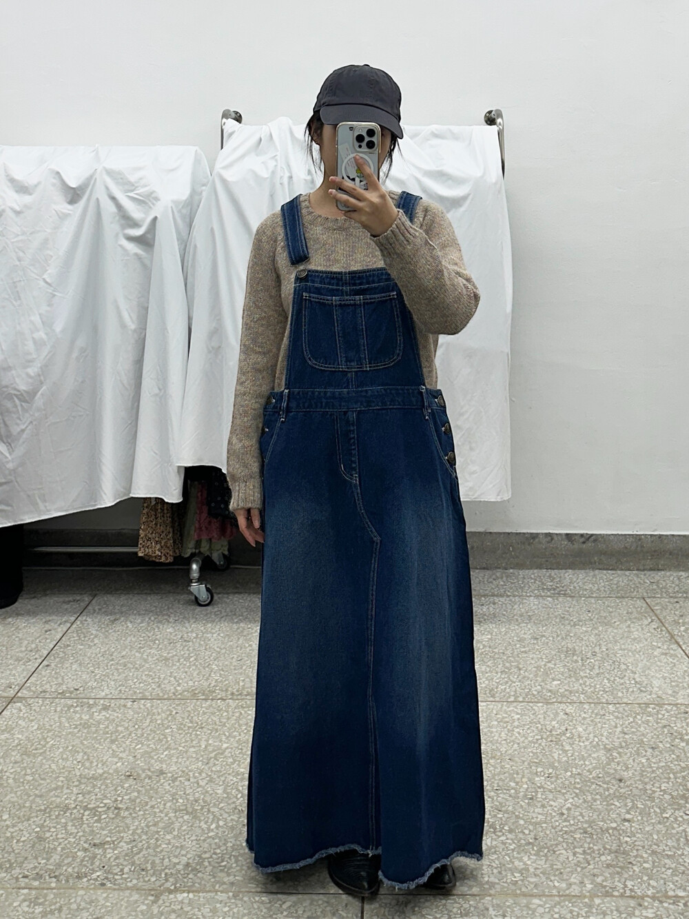 중청 색감의 오버롤 원피스입니다.