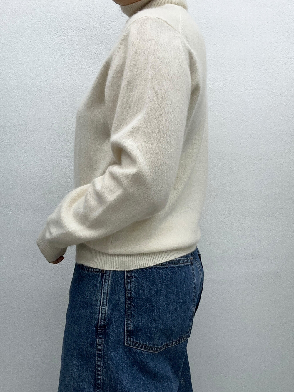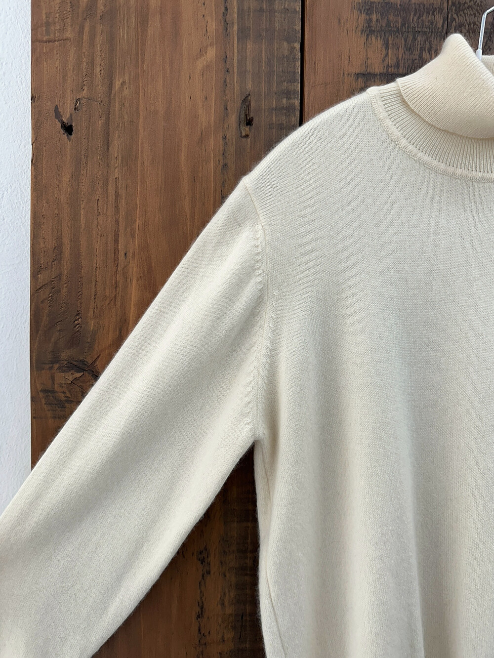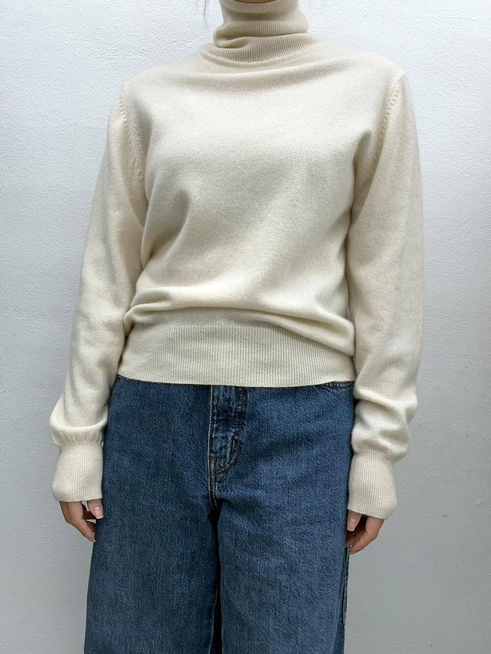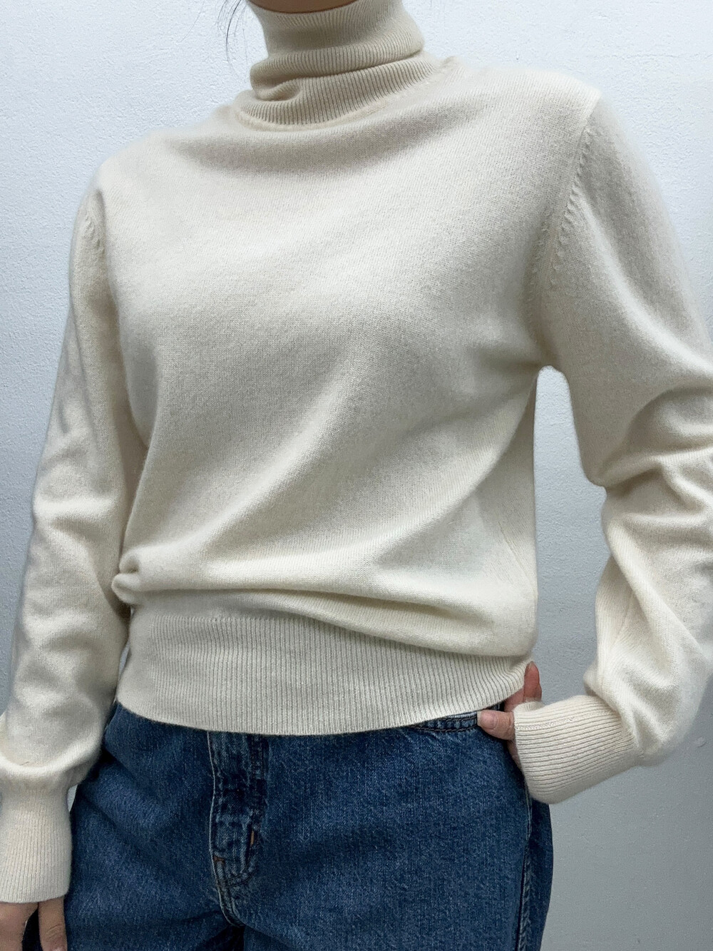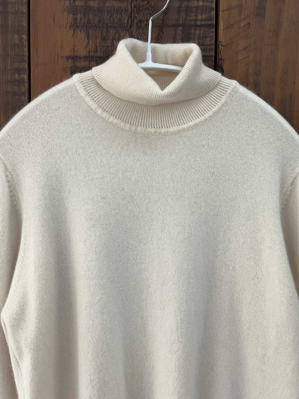 옅은 아이보리 색감의 터틀넥 니트입니다.