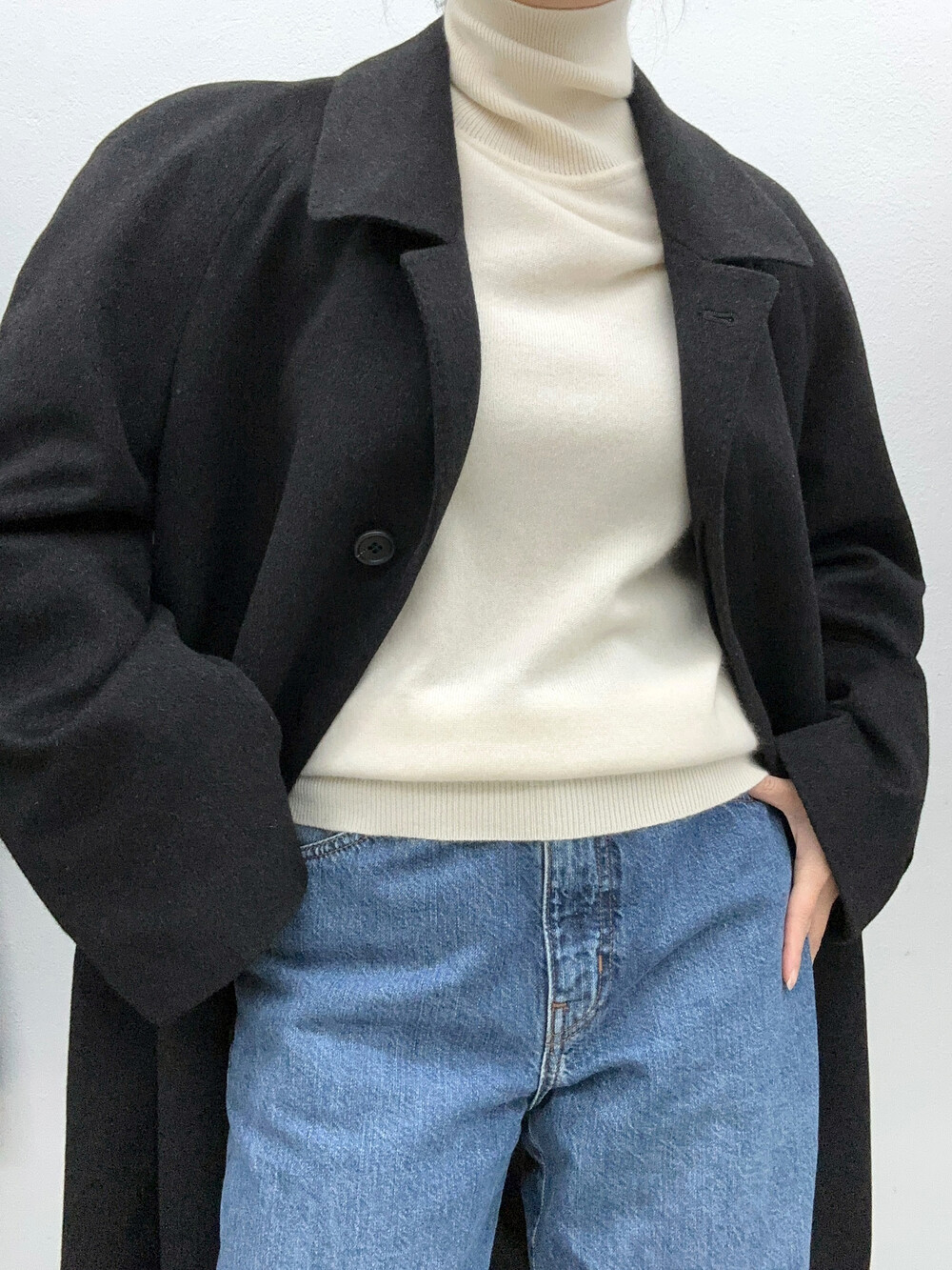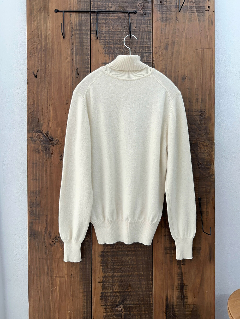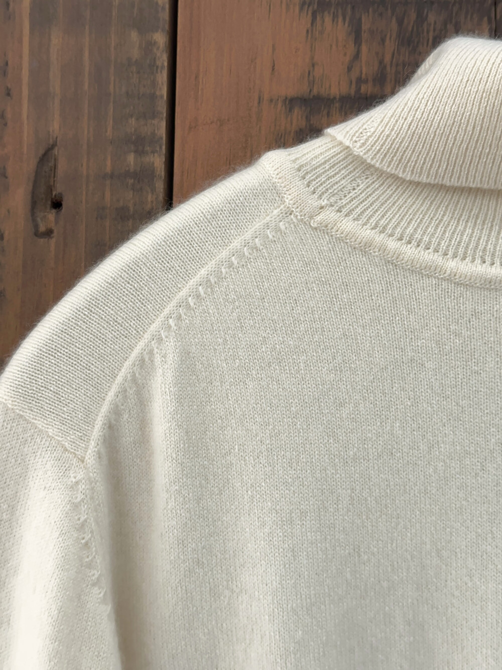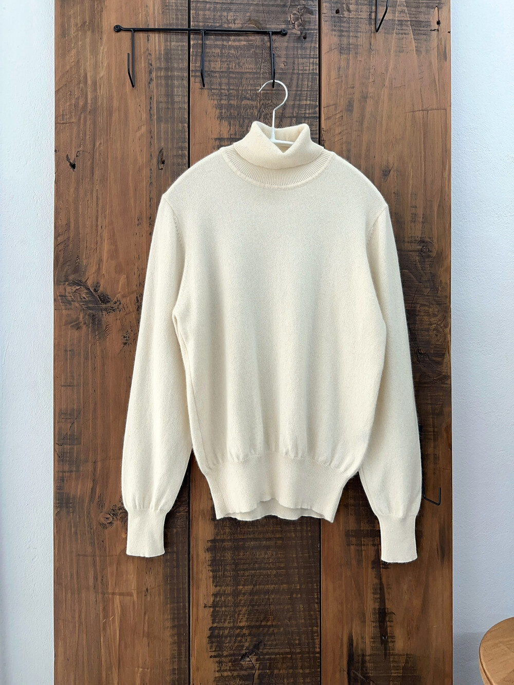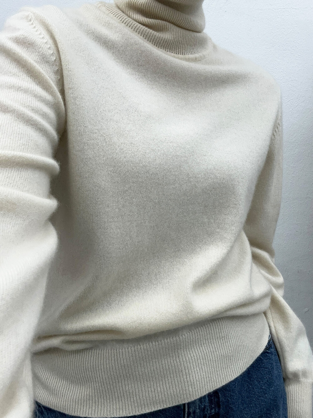 옅은 아이보리 색감의 터틀넥 니트입니다.