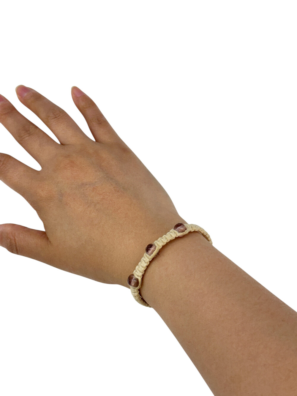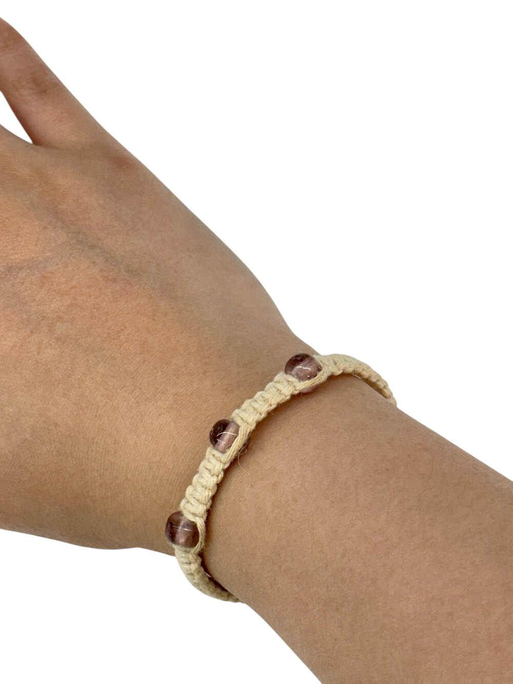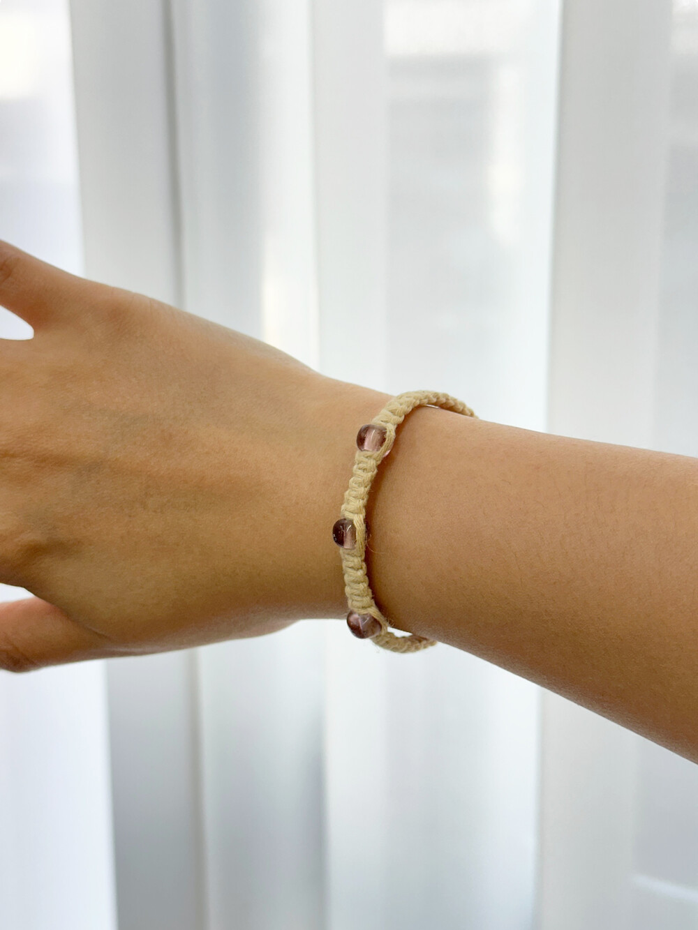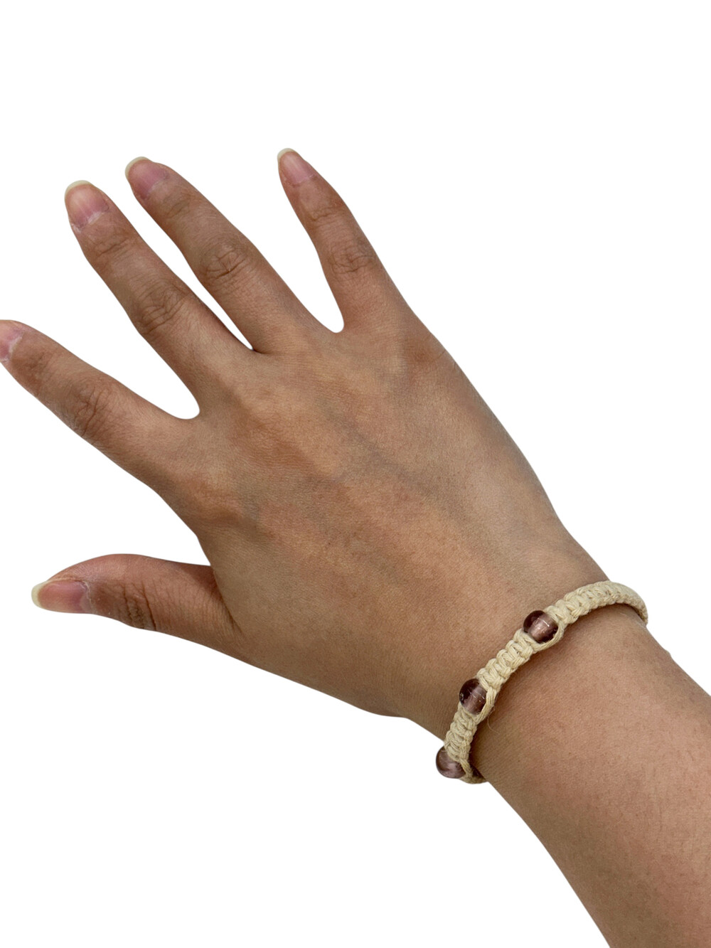 아이보리색 실로 엮인 팔찌는 보라색 유리구슬이 엮여있으며