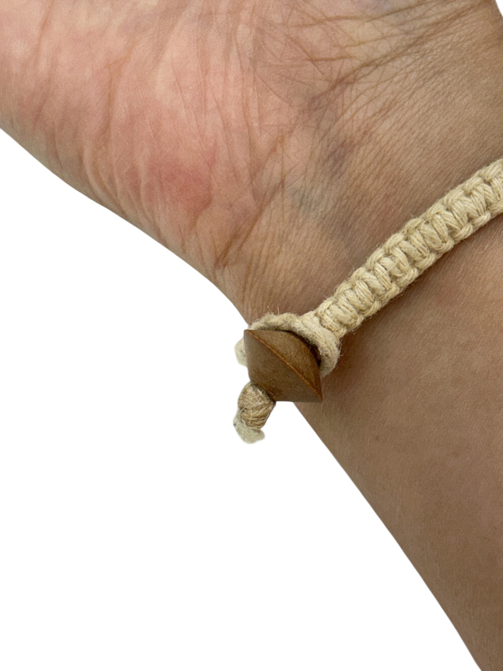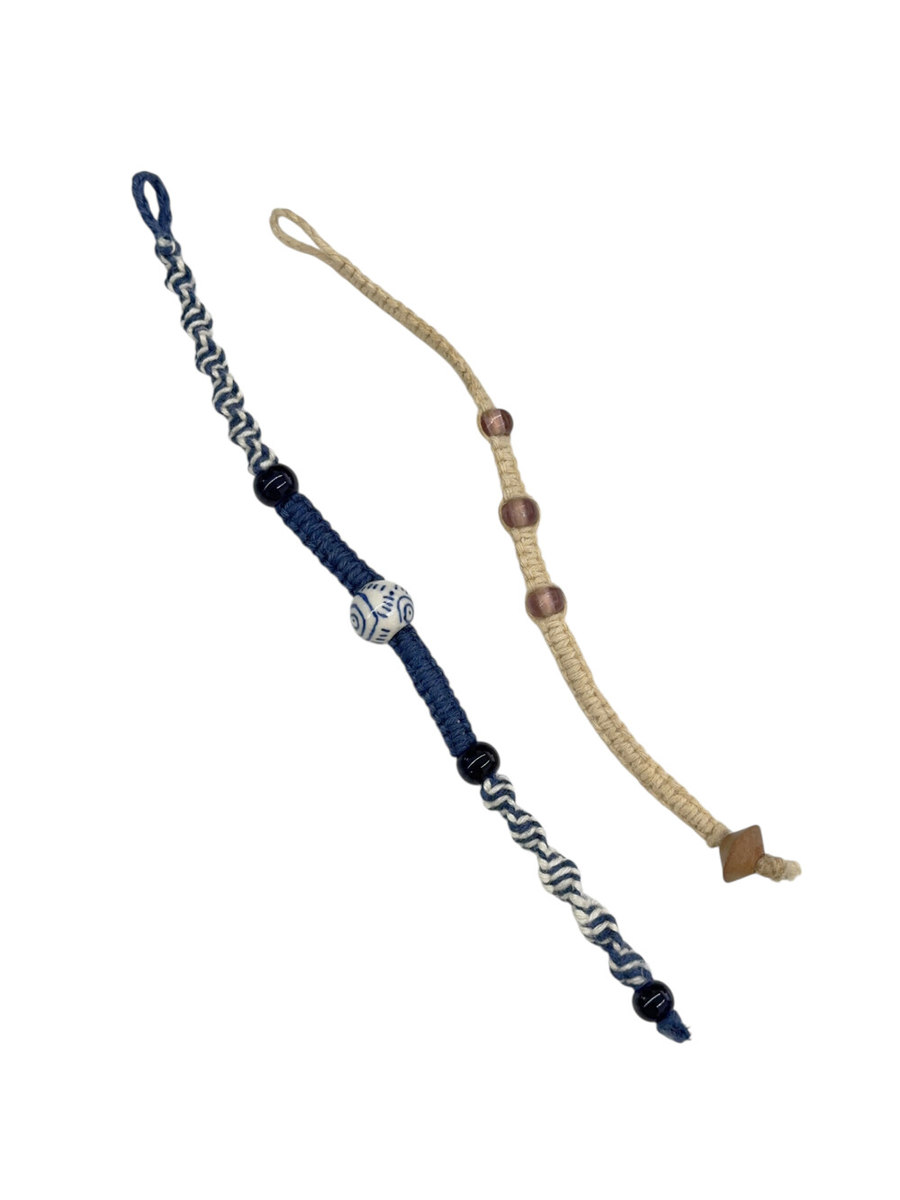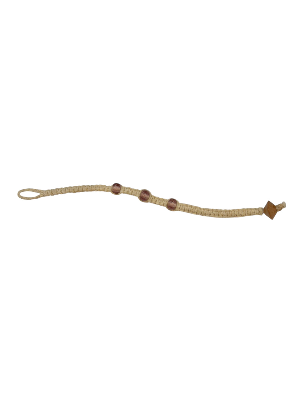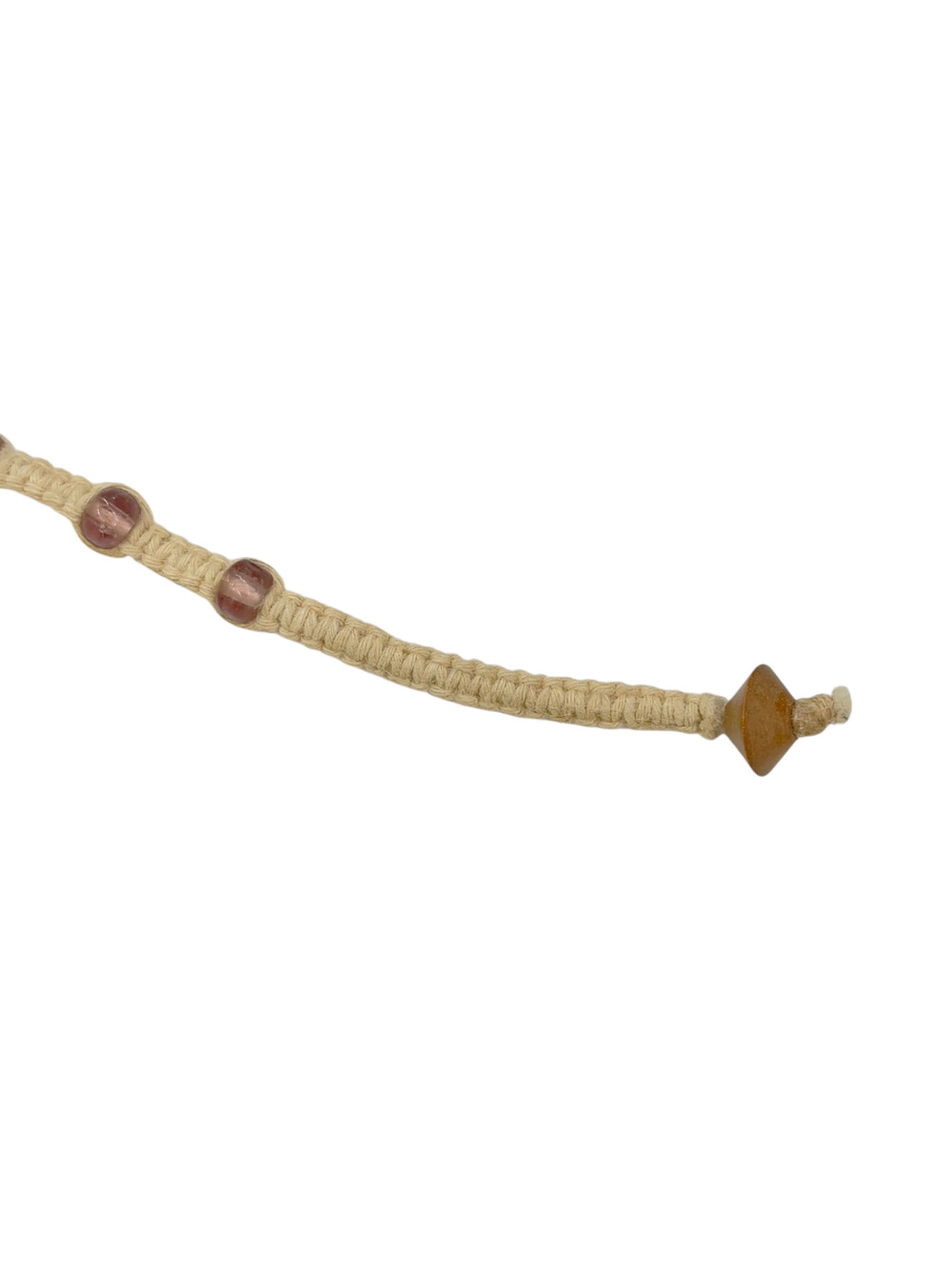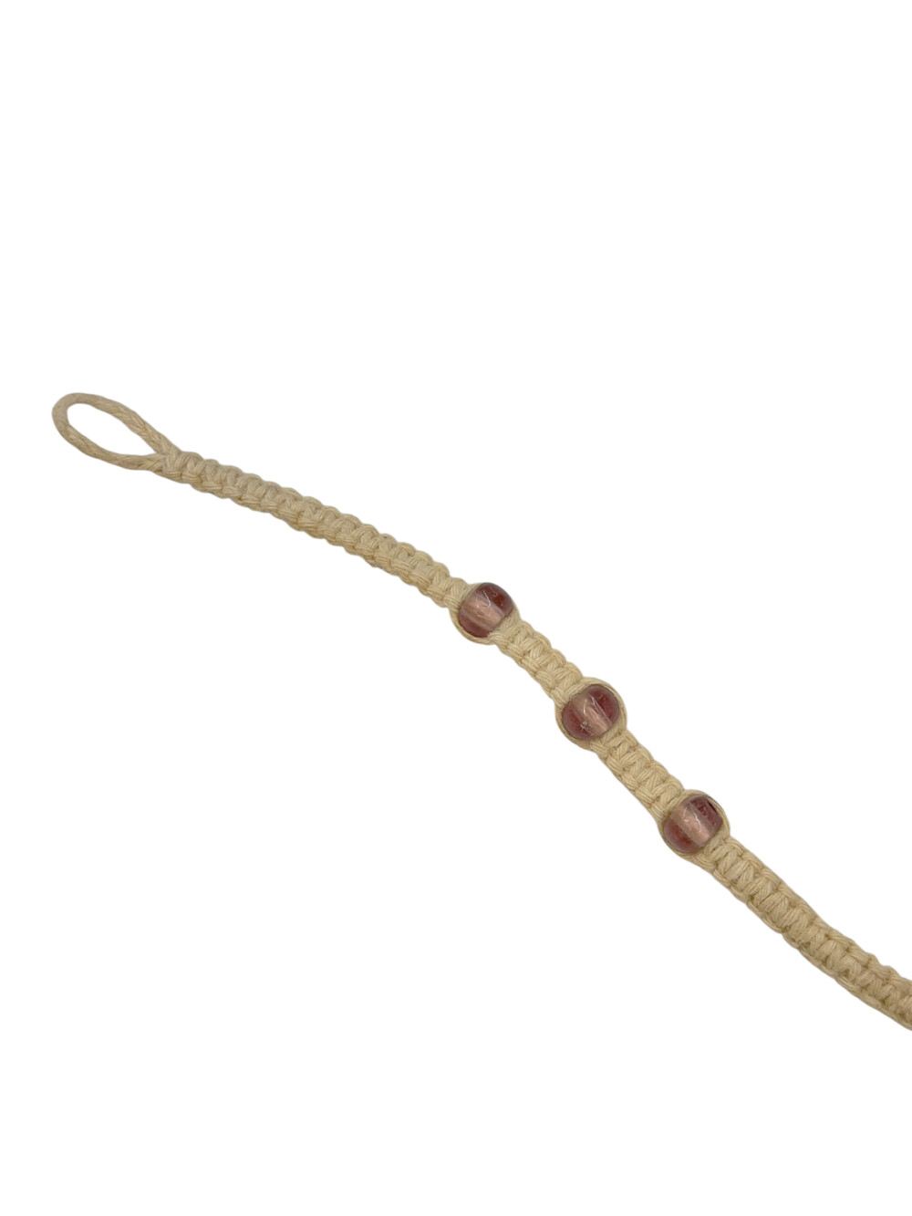 아이보리색 실로 엮인 팔찌는 보라색 유리구슬이 엮여있으며