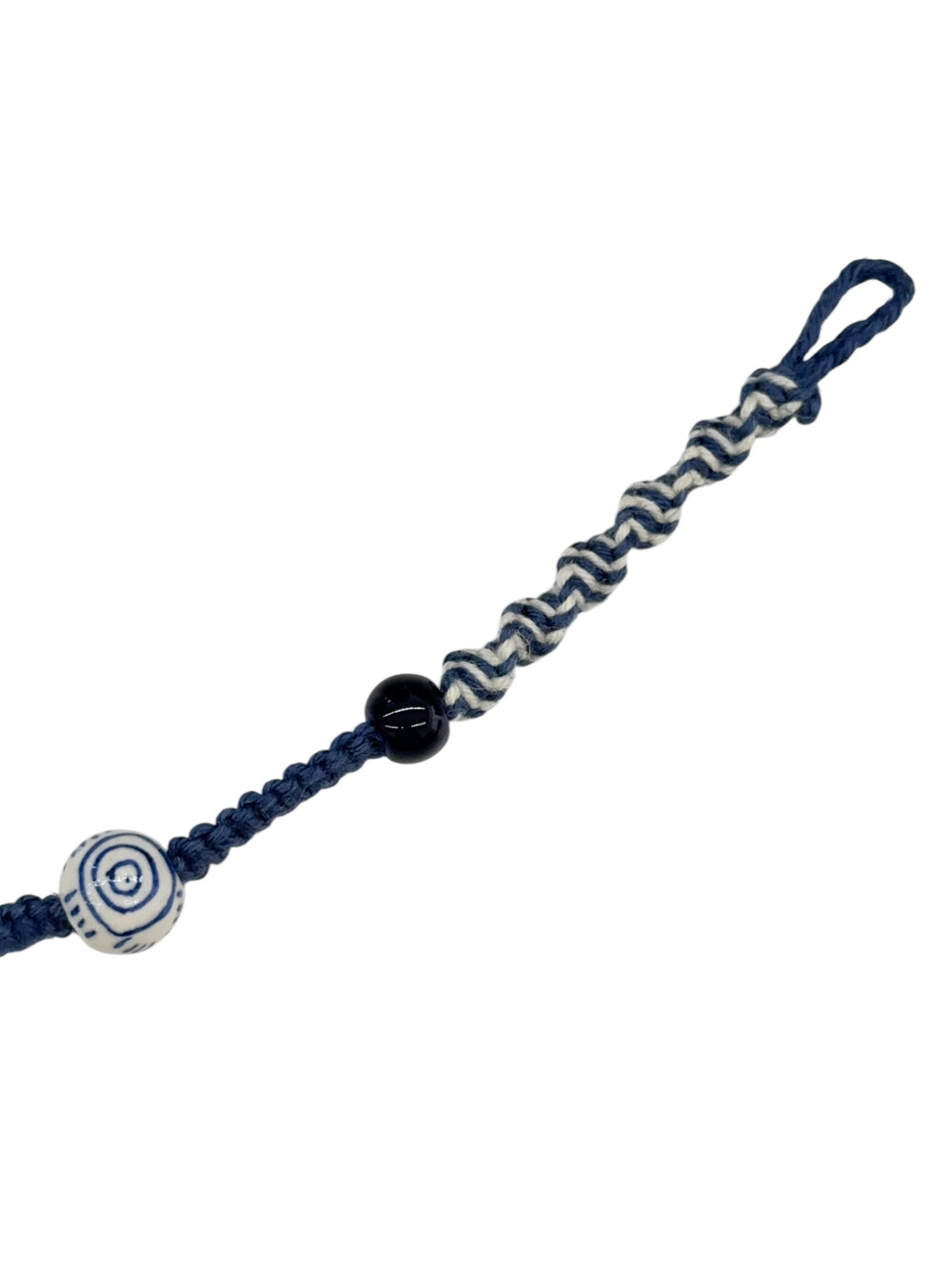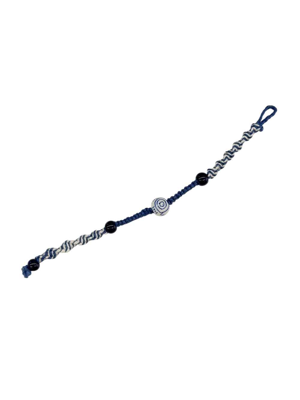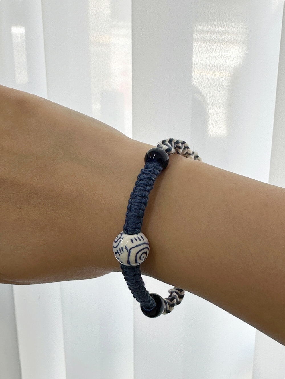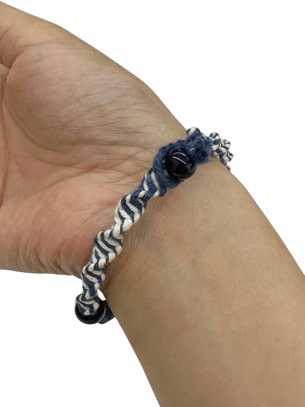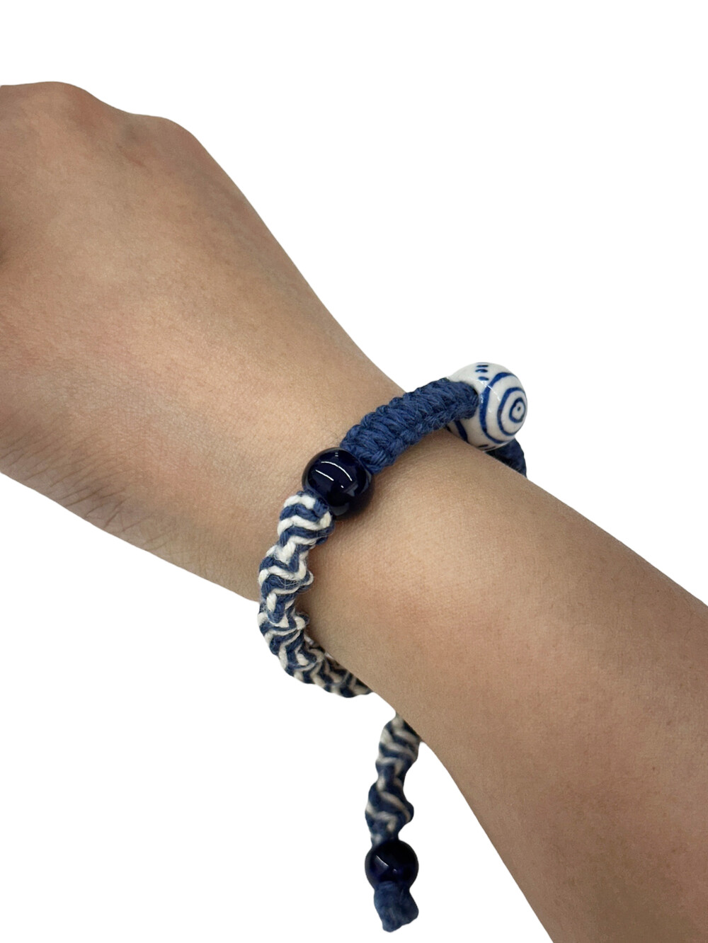 파란색 실로 엮인 팔찌는 일부 나선모양새로 짜여졌으며