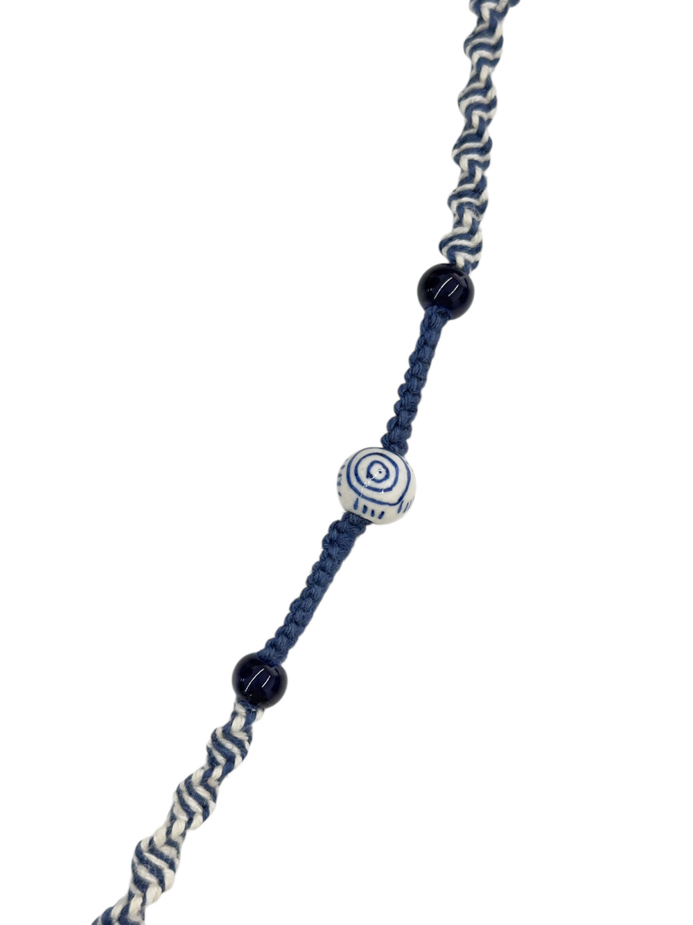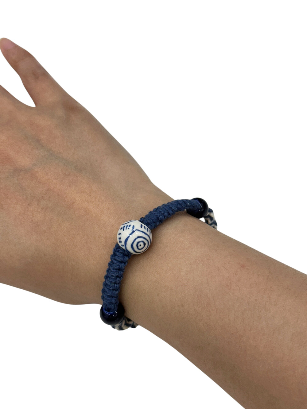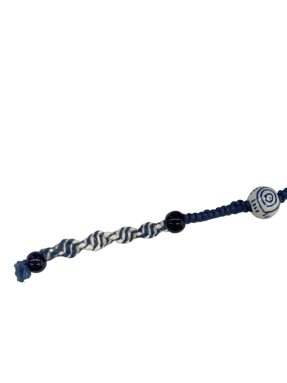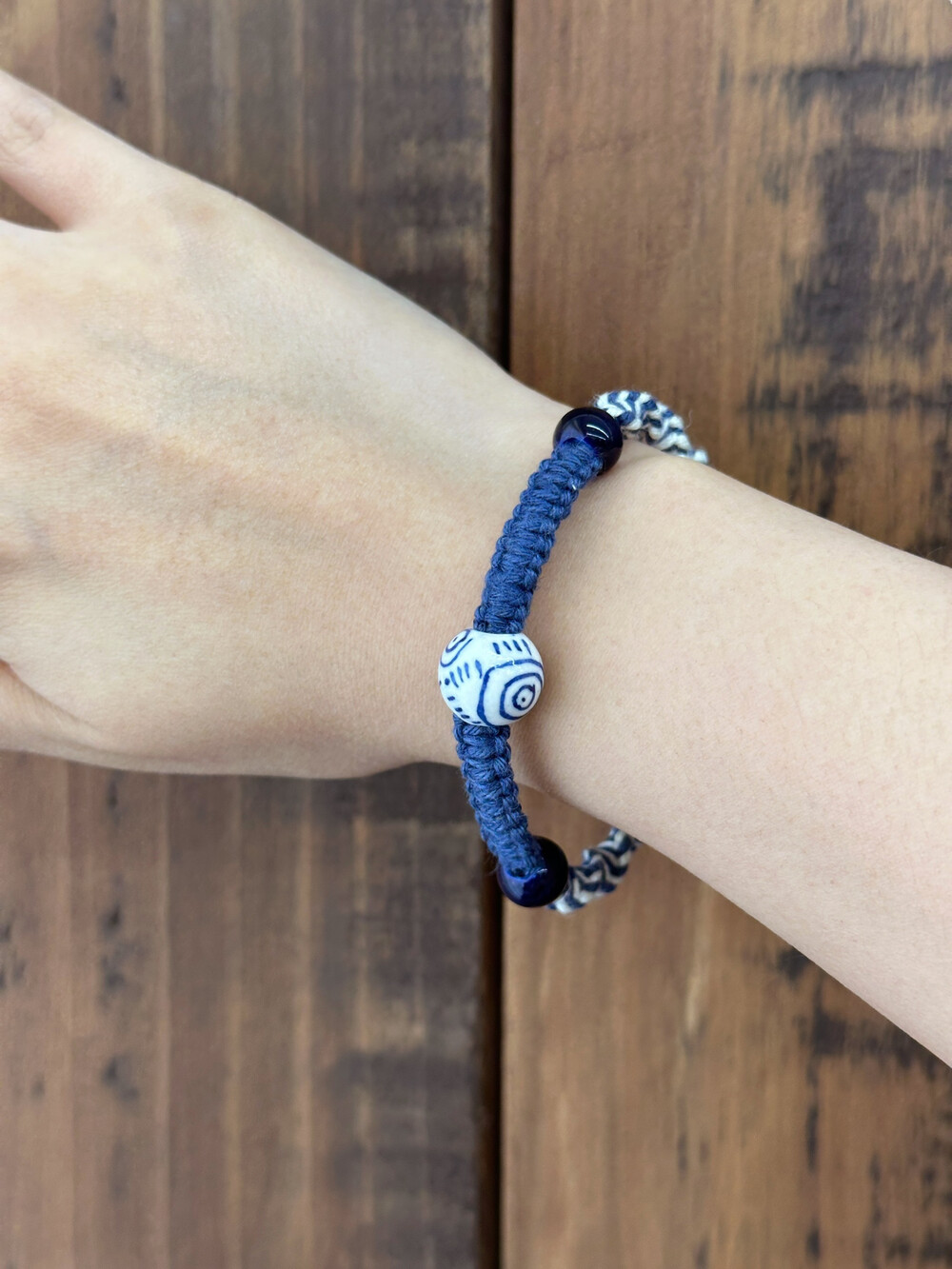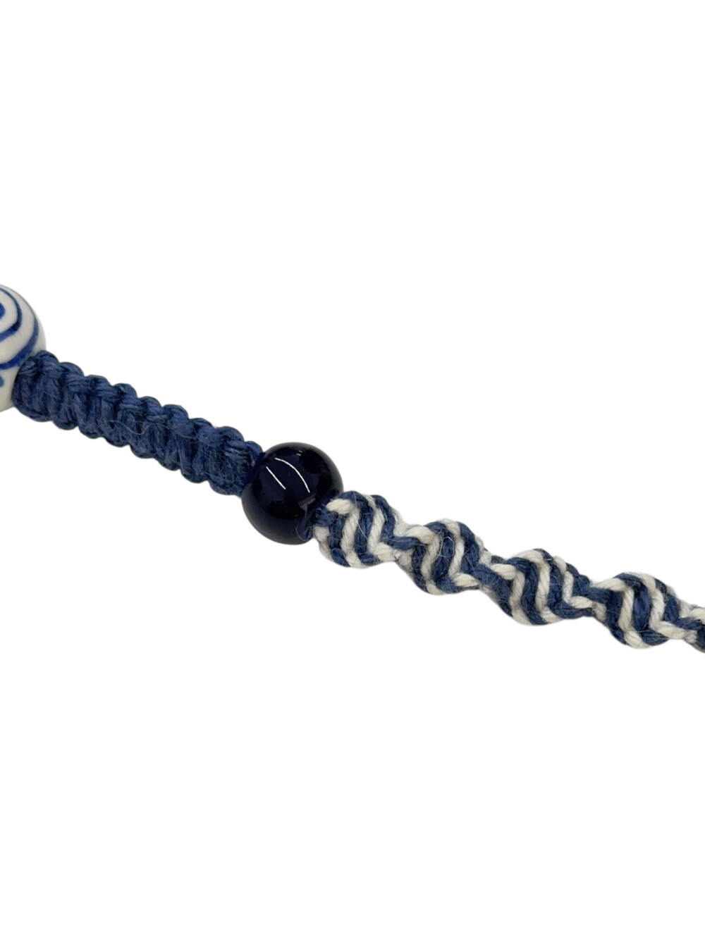 파란색 실로 엮인 팔찌는 일부 나선모양새로 짜여졌으며