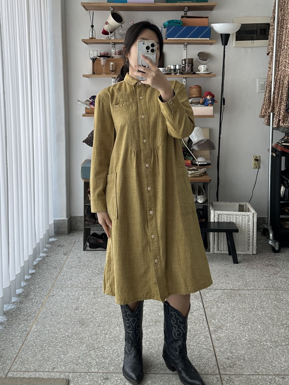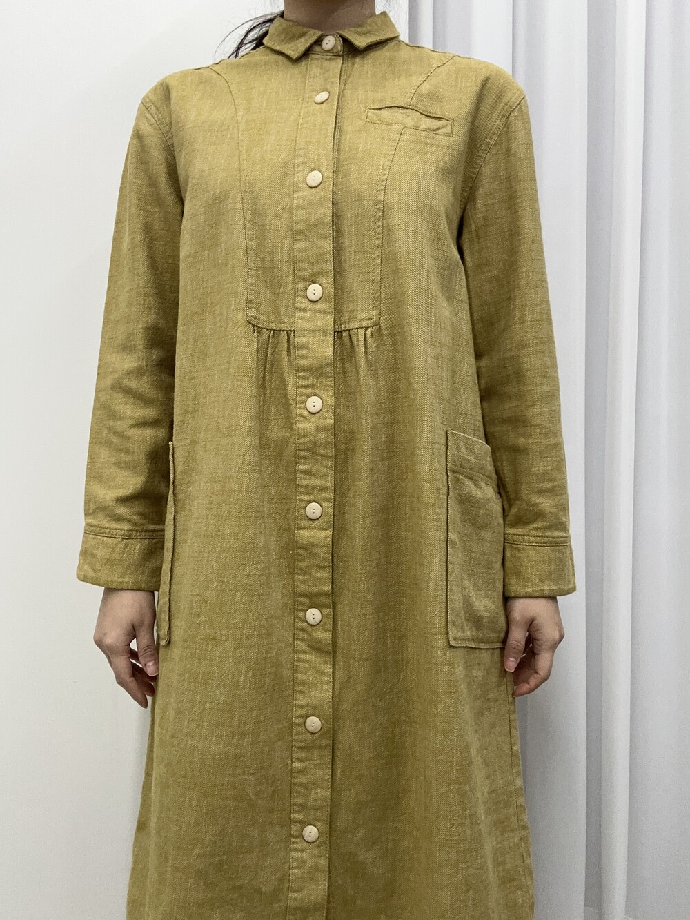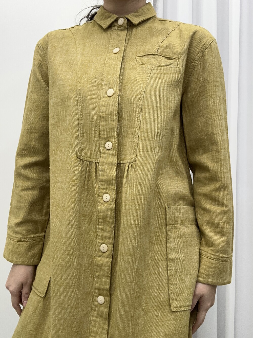 겨자색이 귀여운 셔츠 원피스입니다.