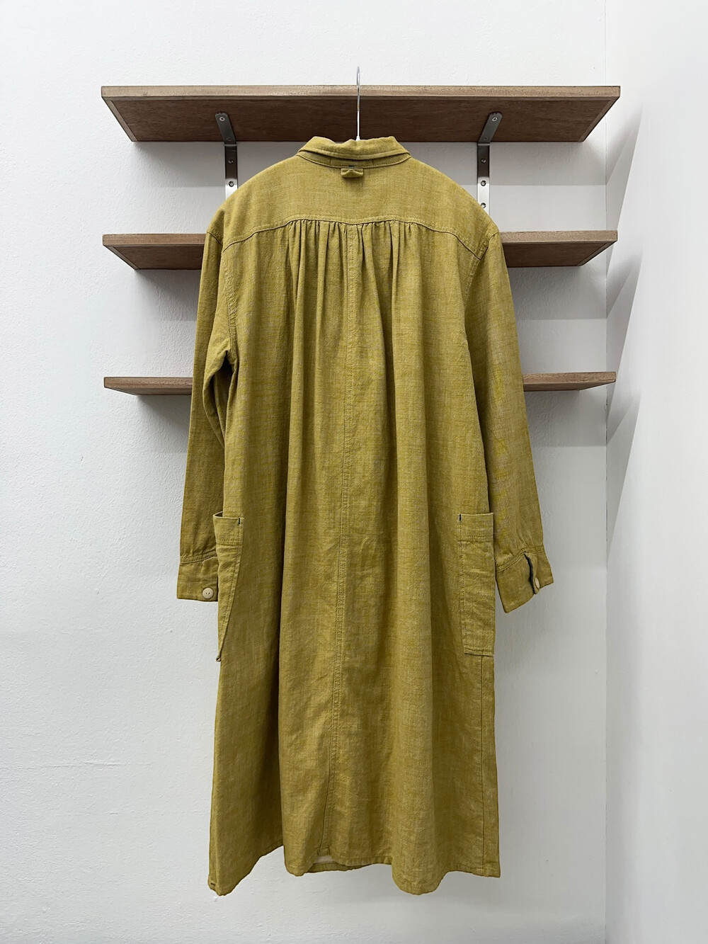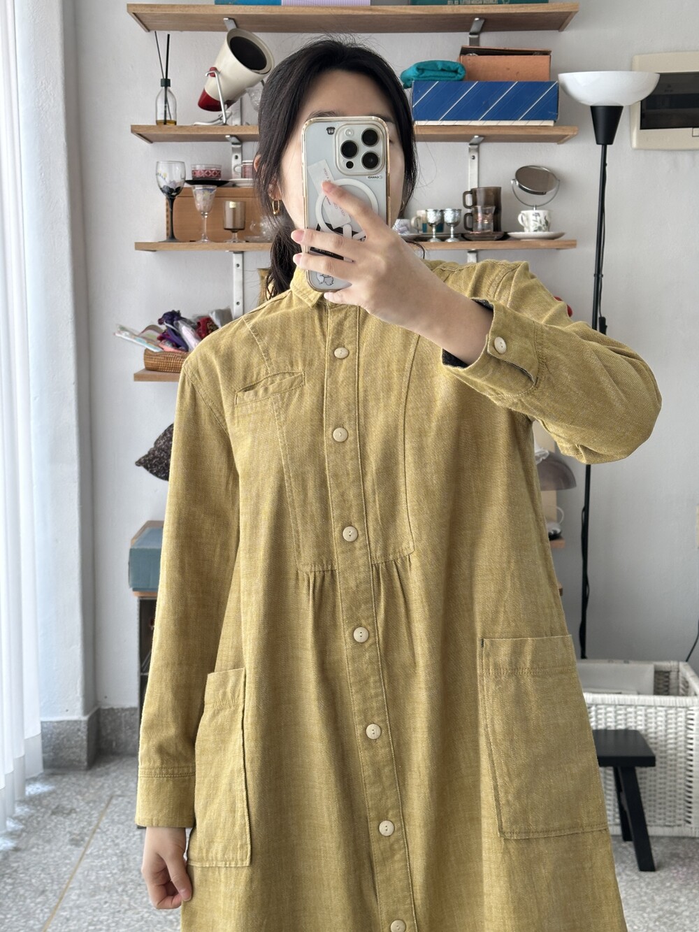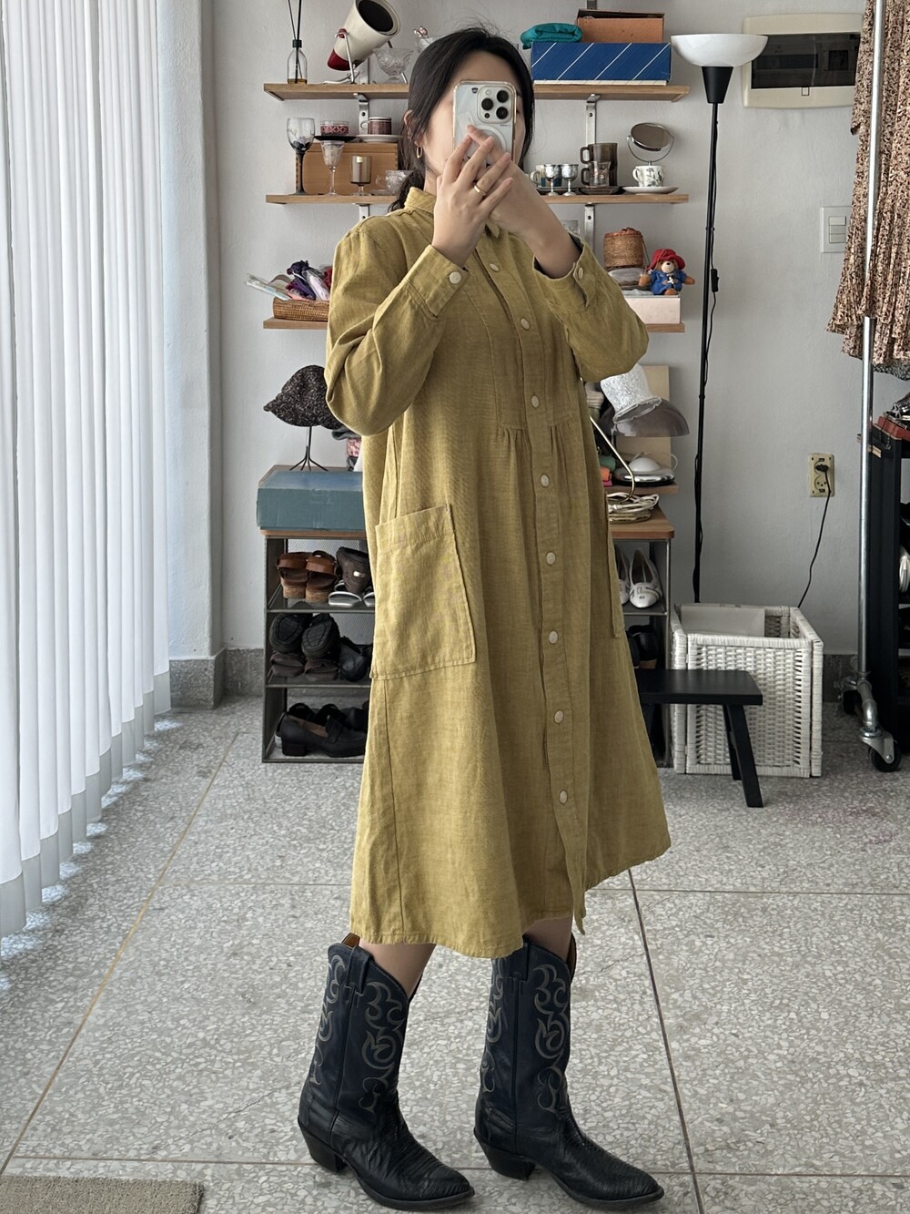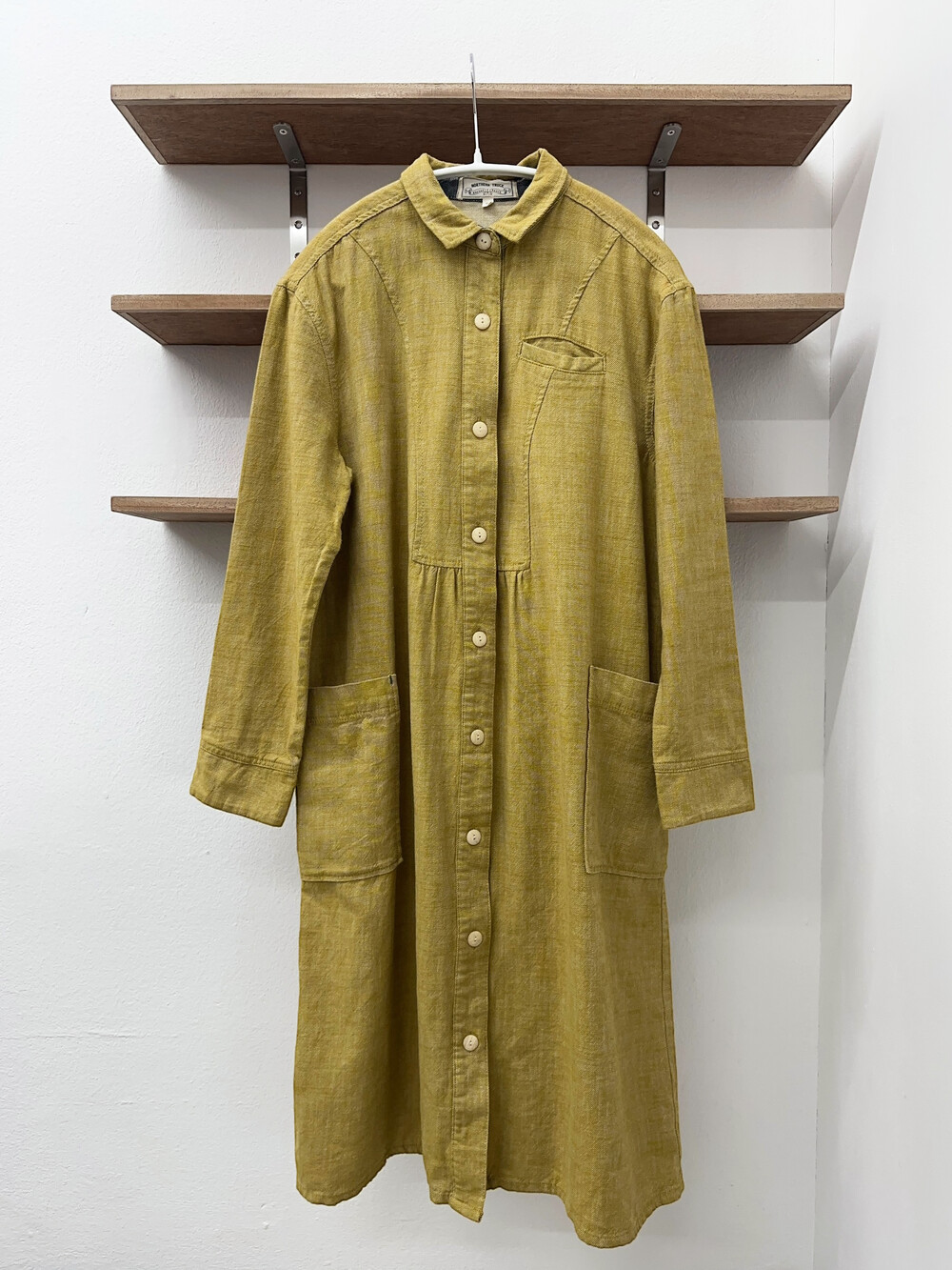 겨자색이 귀여운 셔츠 원피스입니다.