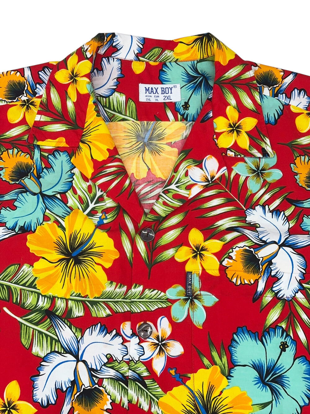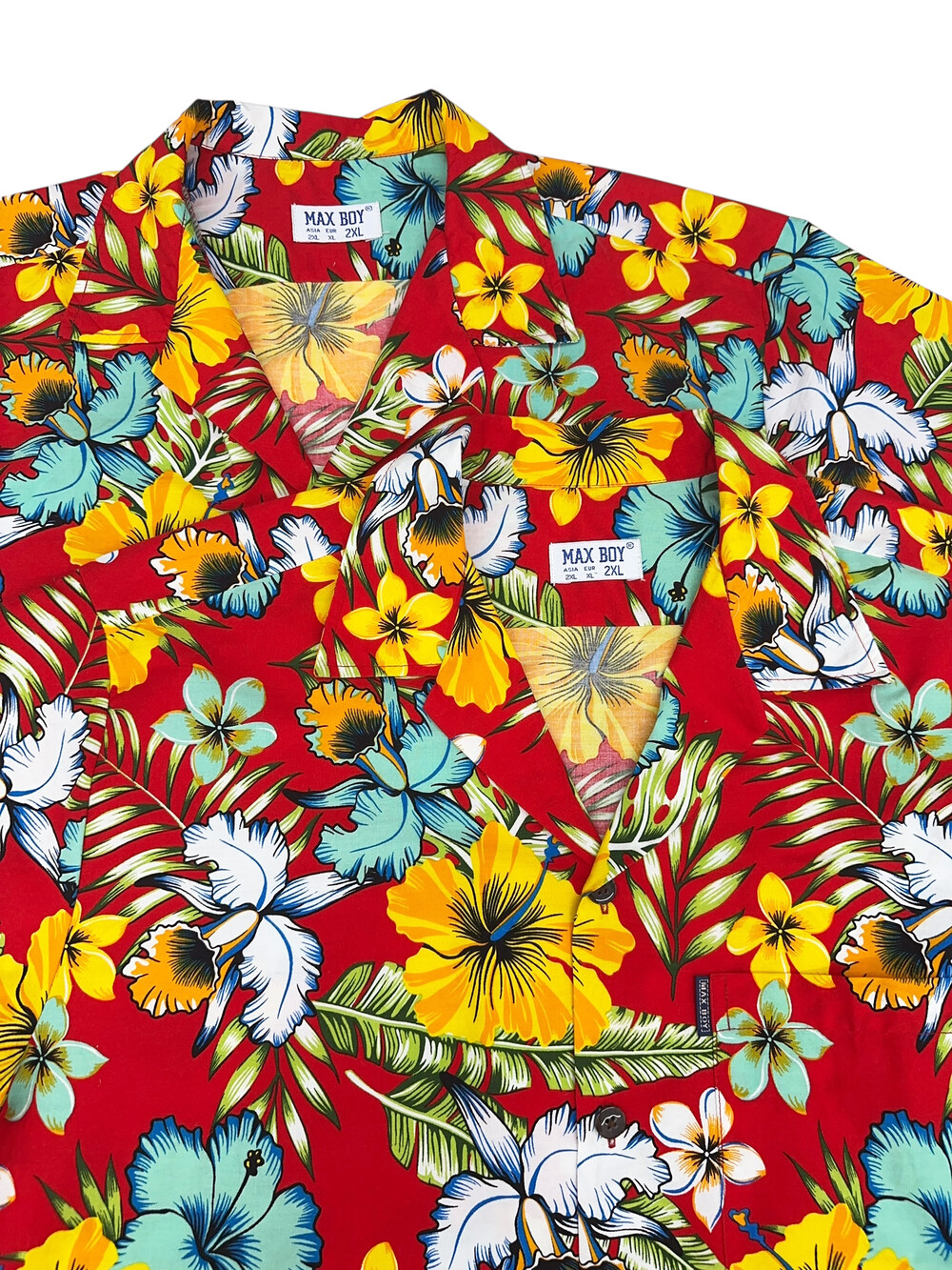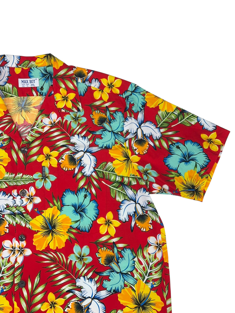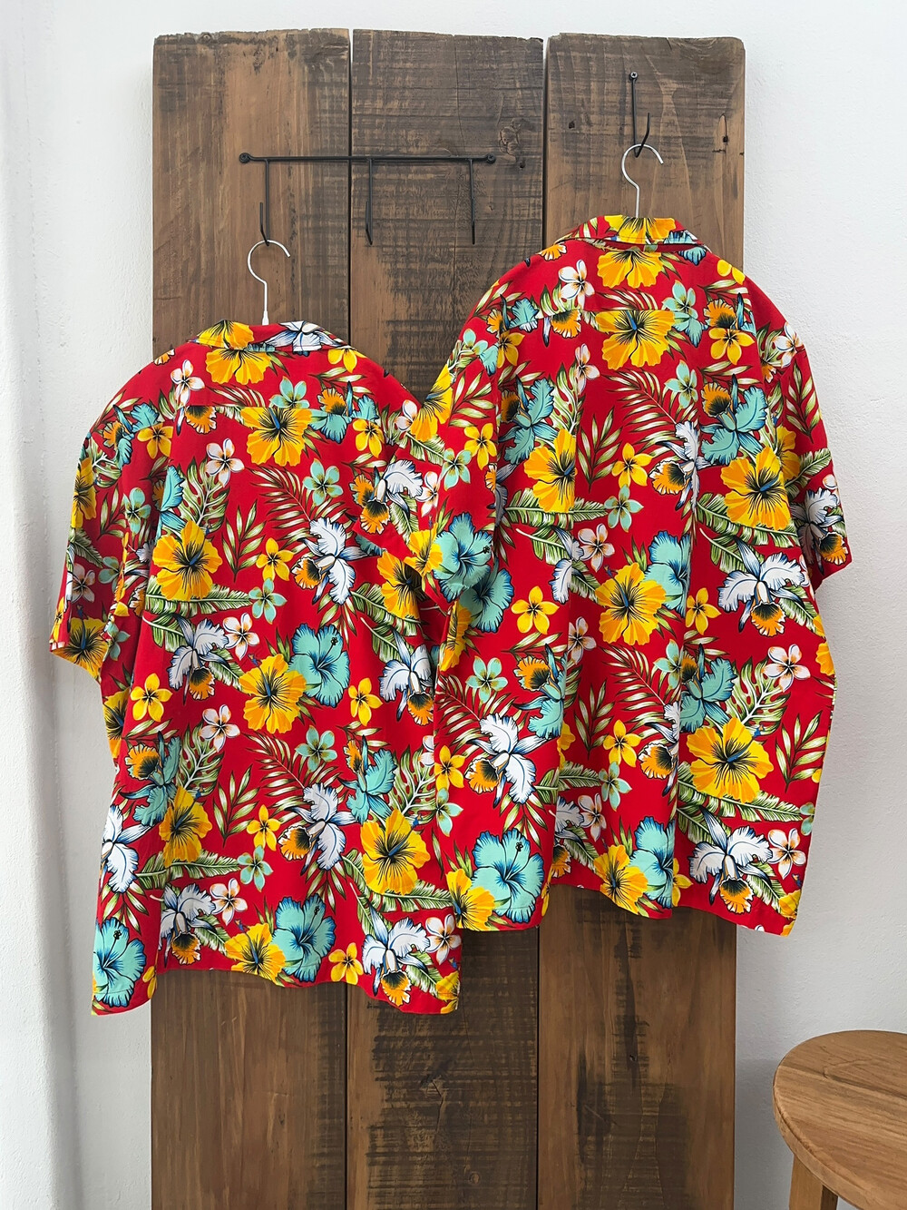 쨍한 빨간색상의 하와이안 셔츠입니다.