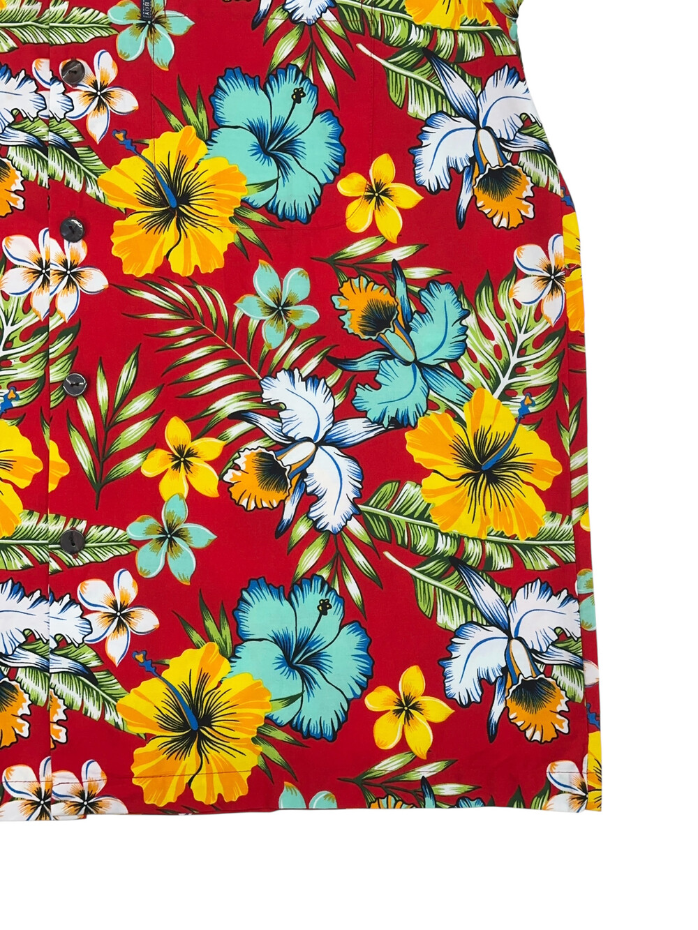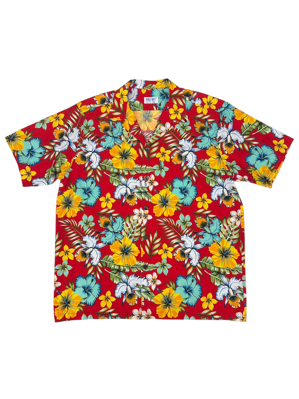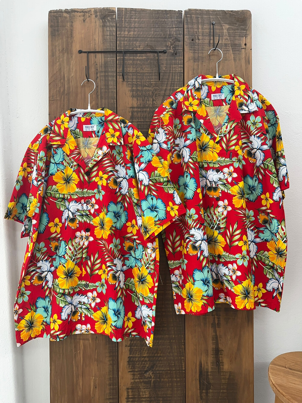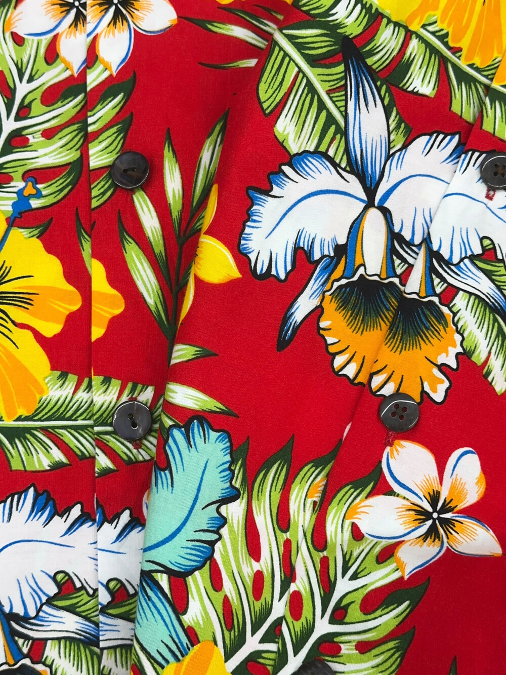쨍한 빨간색상의 하와이안 셔츠입니다.