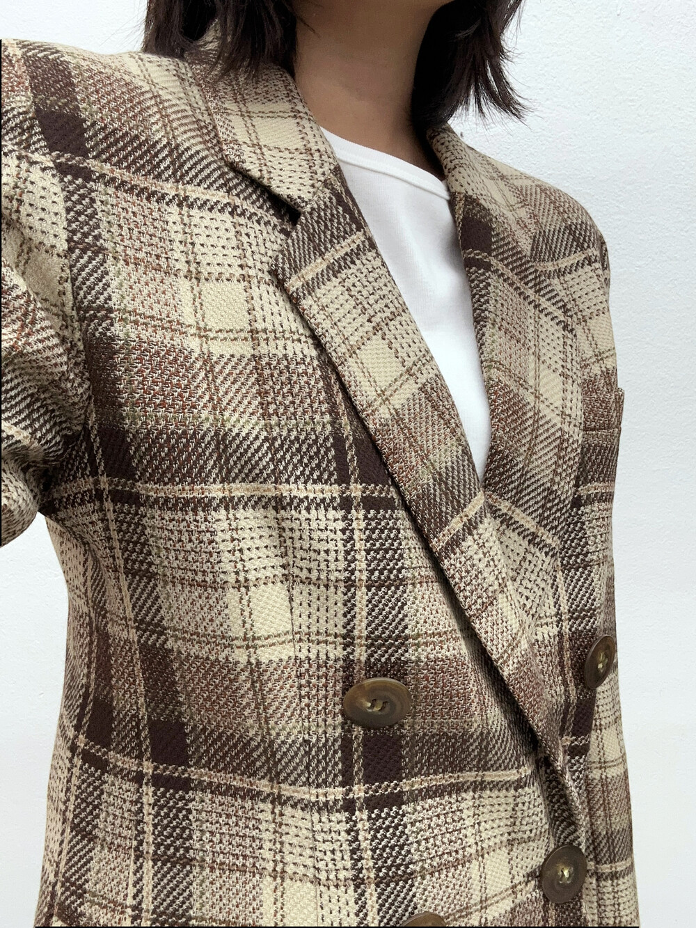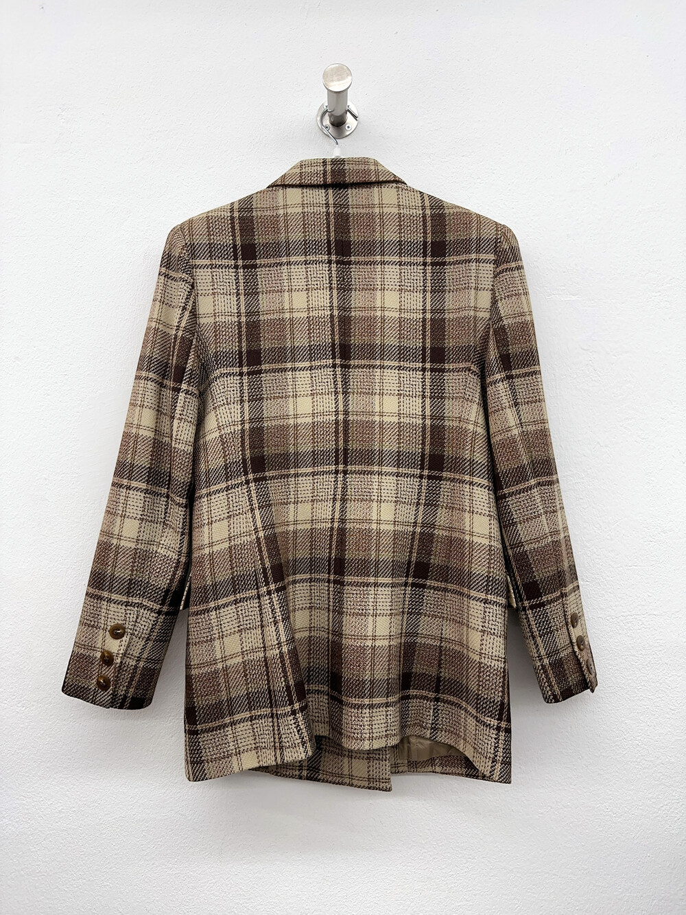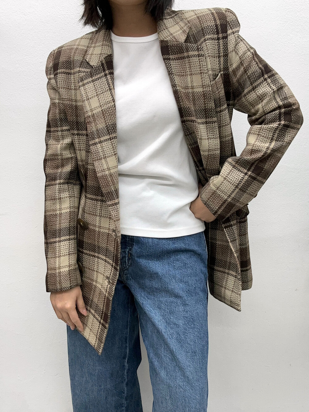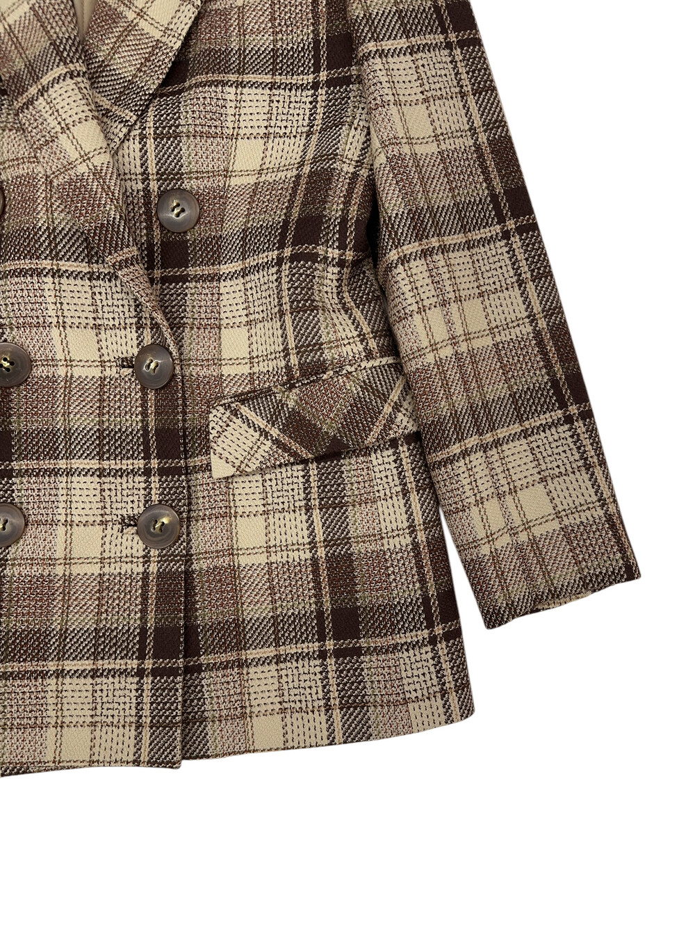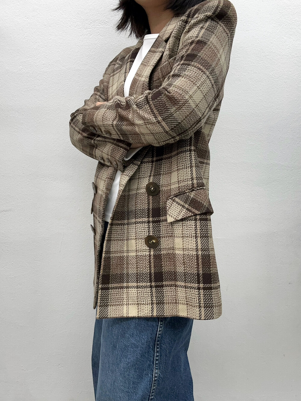 베이지와 갈색톤의 체크패턴 자켓입니다.