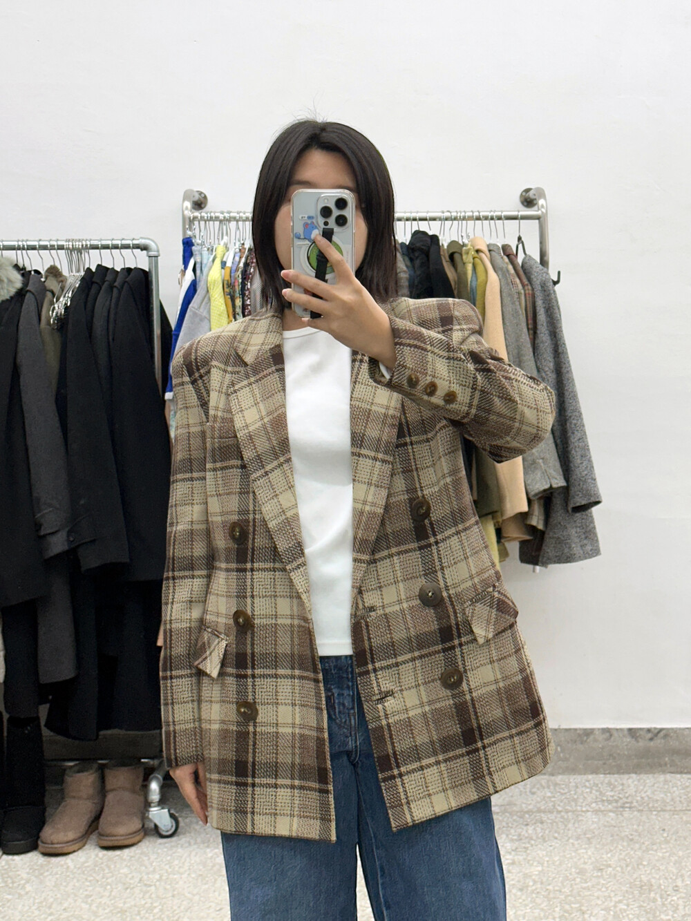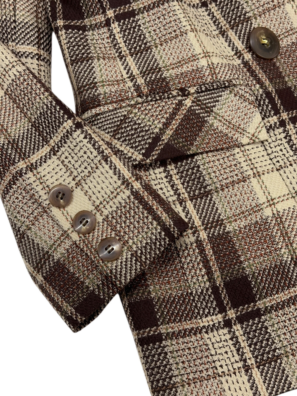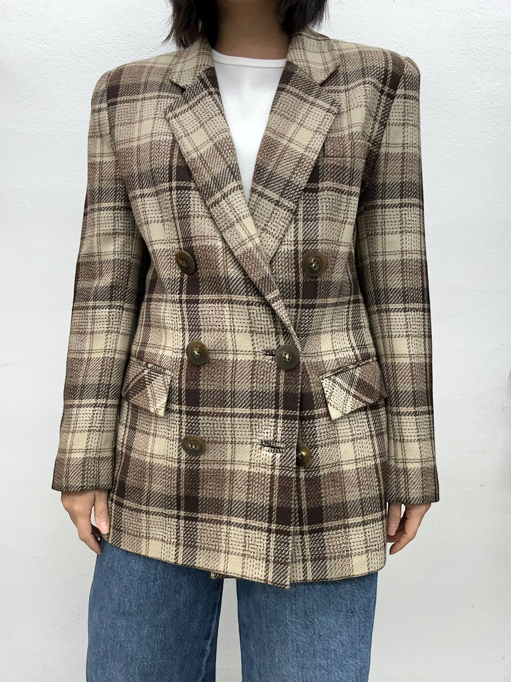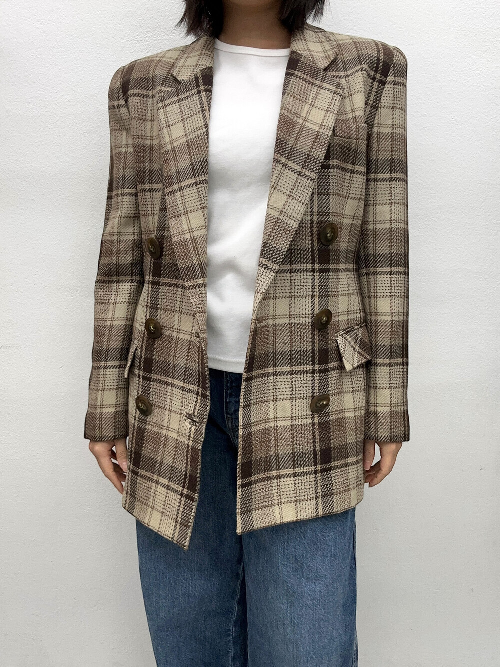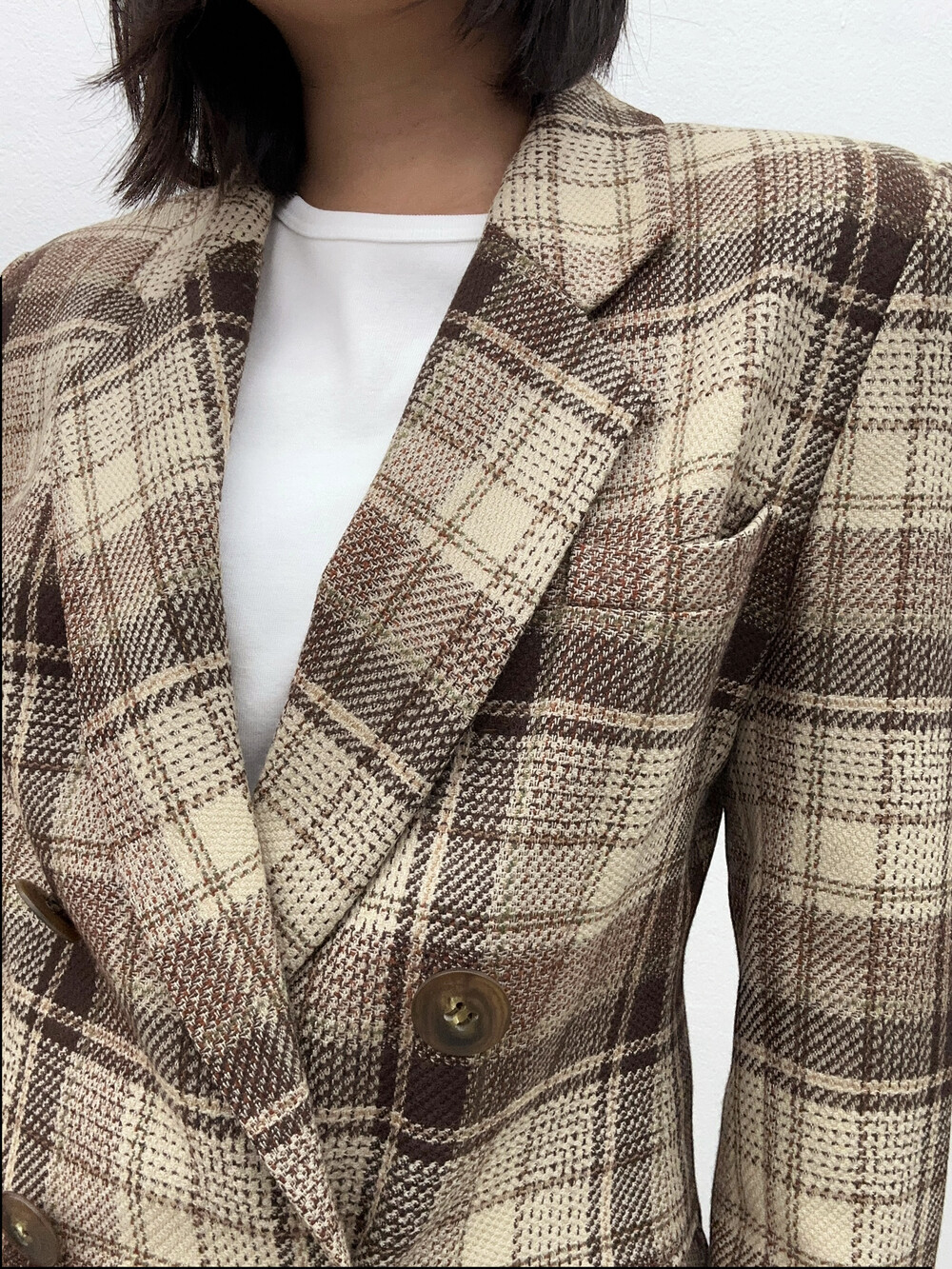 베이지와 갈색톤의 체크패턴 자켓입니다.
