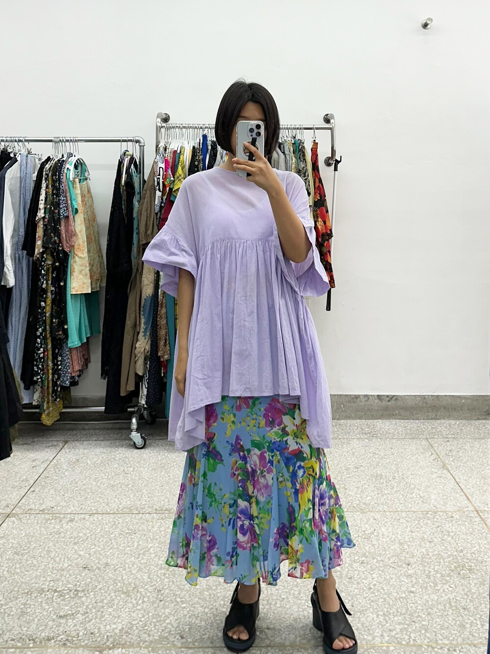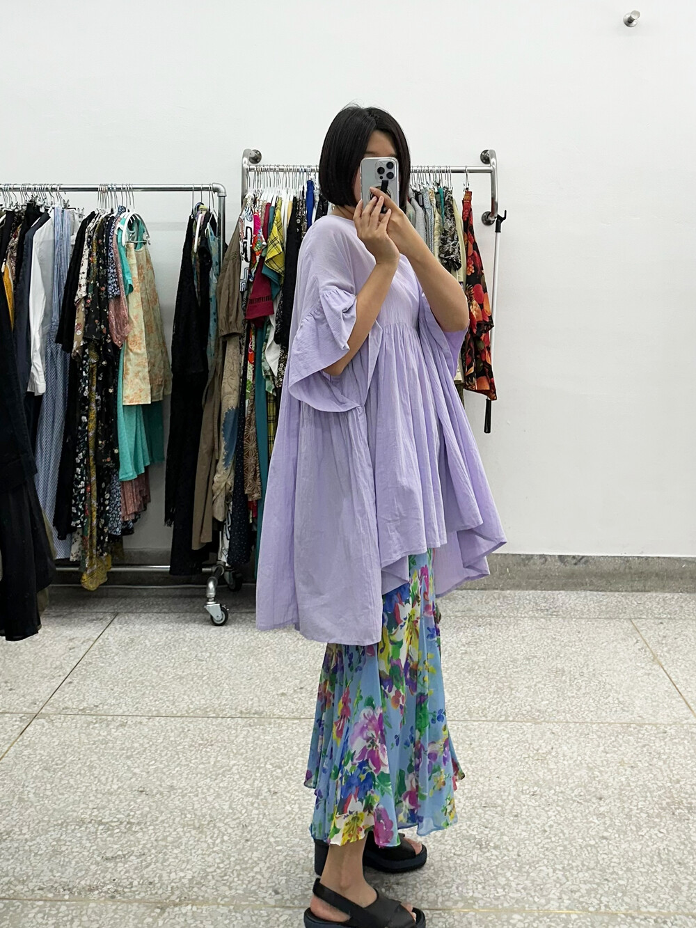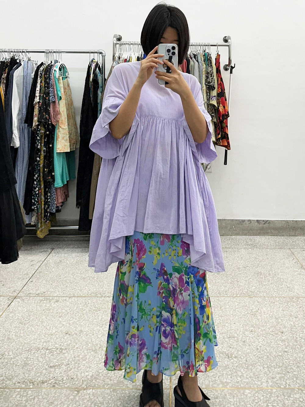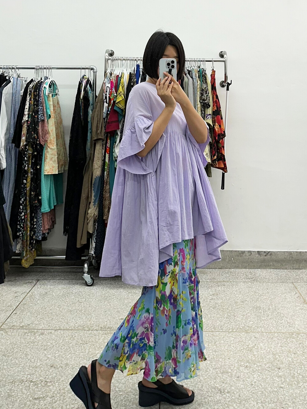 하단은 비대칭으로 멋스럽게 러플 더해졌으며