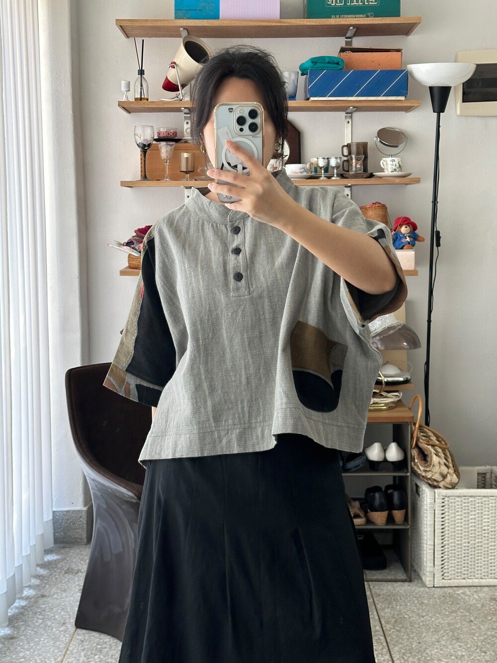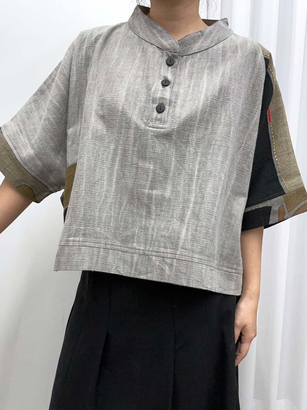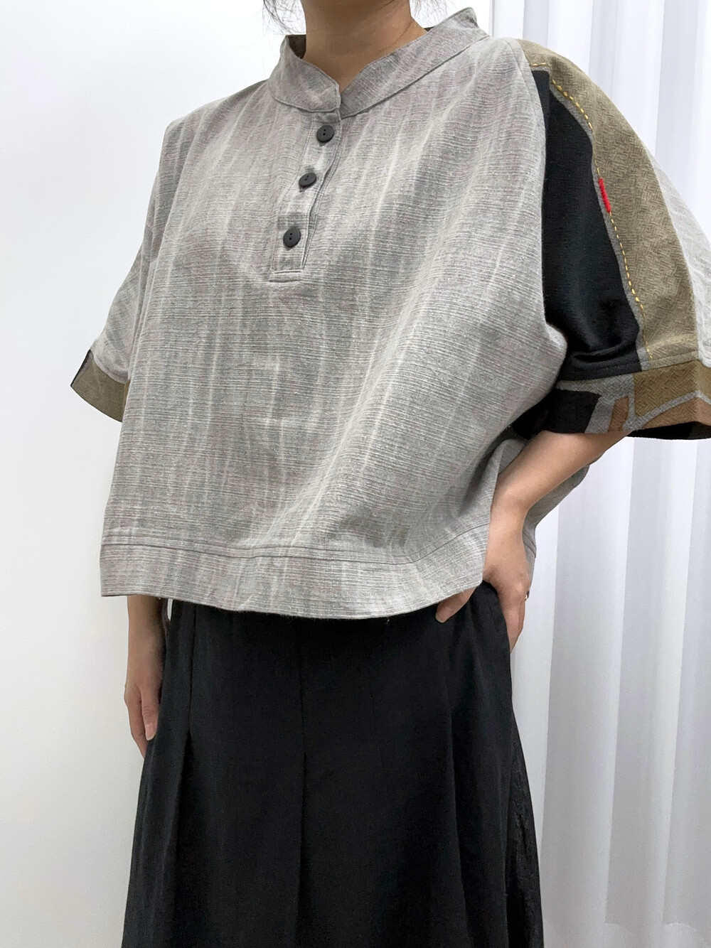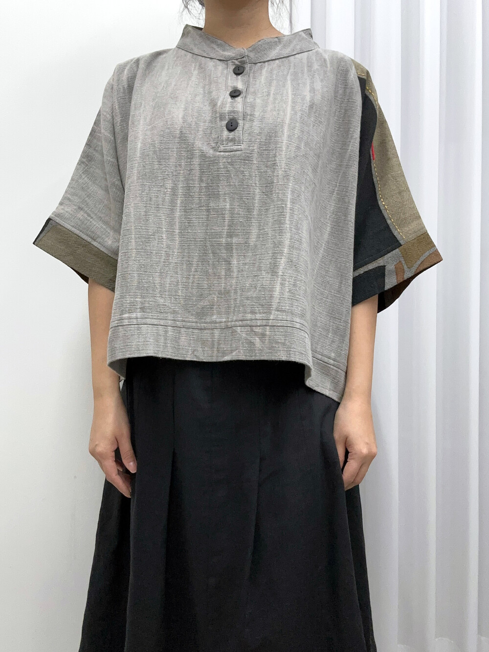 현대적인 패턴의 패치워크가 짧은 길이감의 옷과