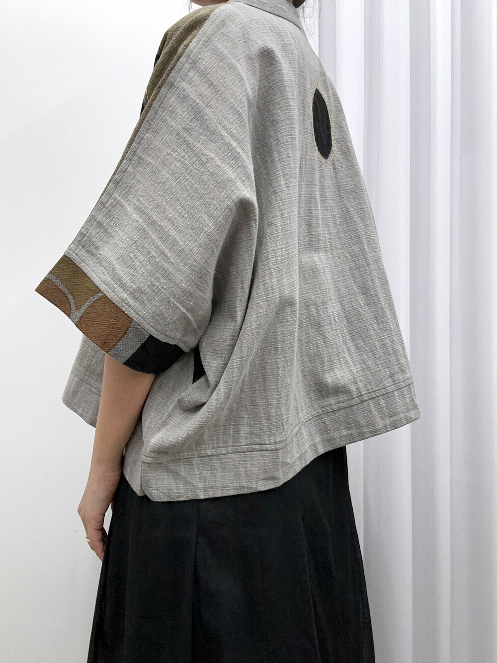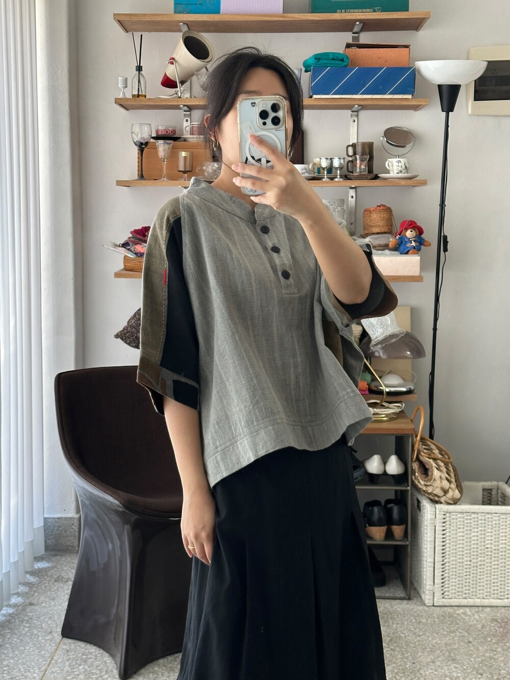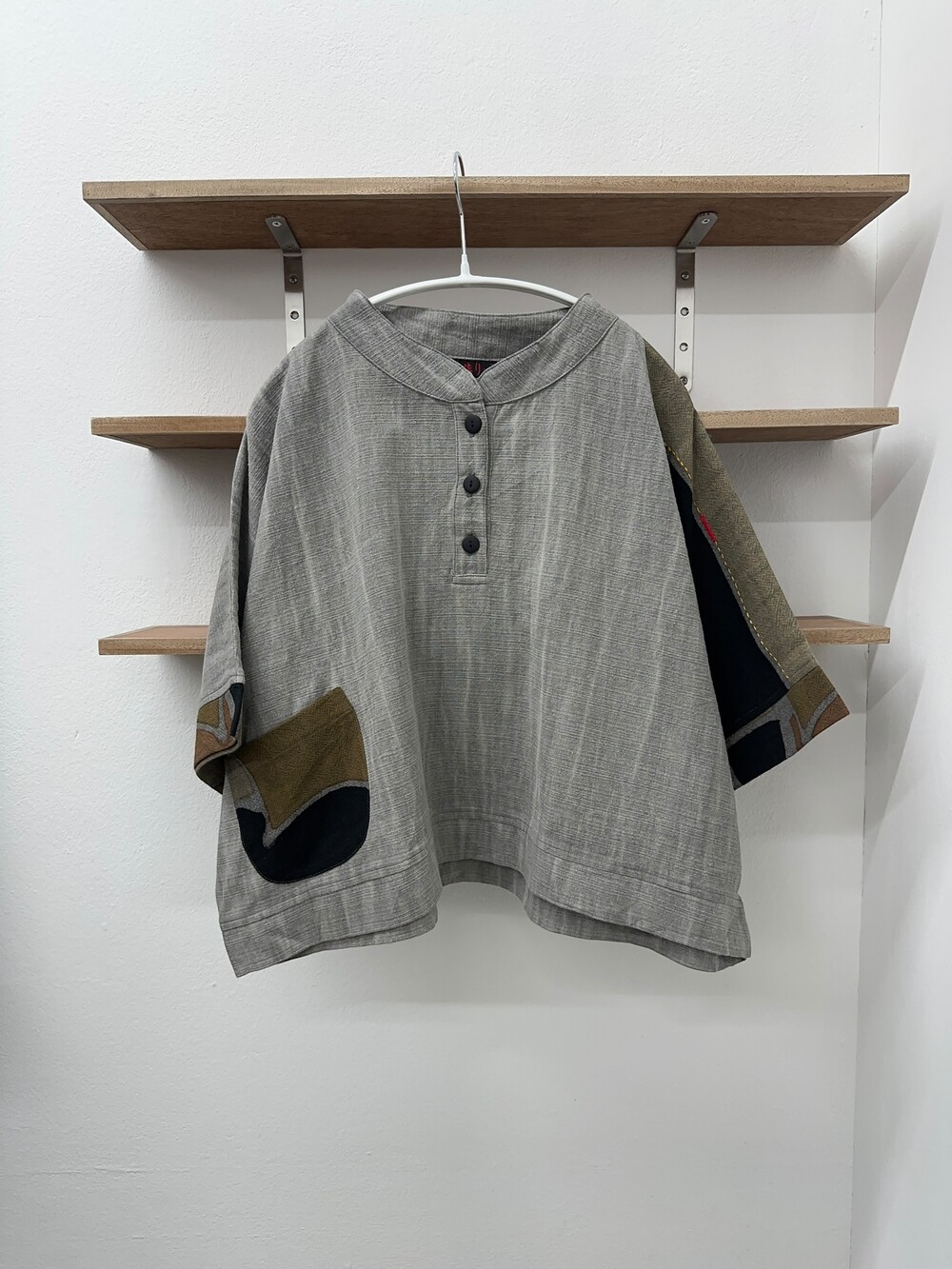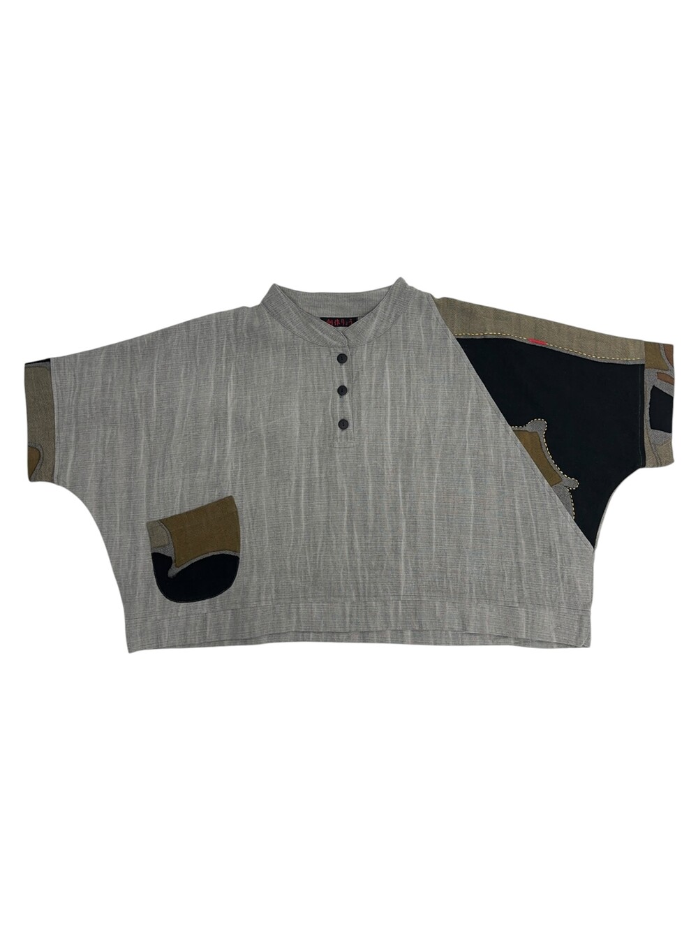 현대적인 패턴의 패치워크가 짧은 길이감의 옷과